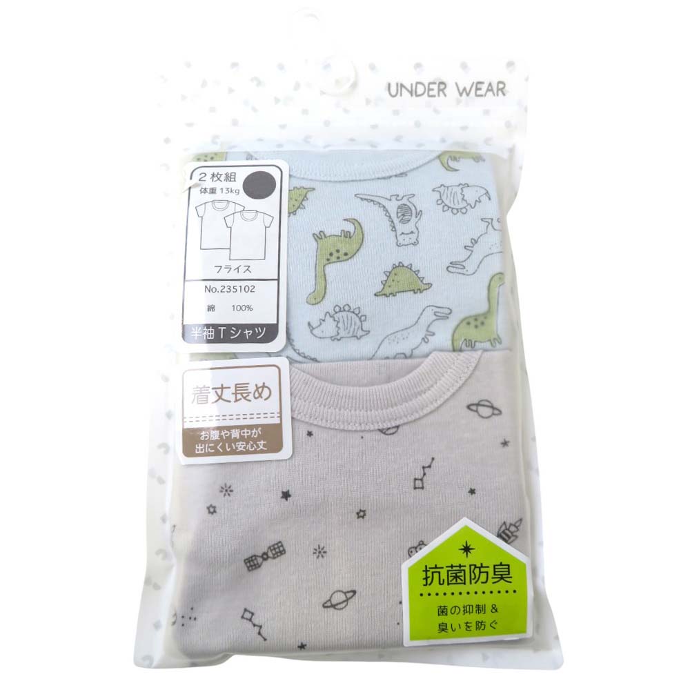 柔らかくて快適なフライス生地。伸縮があり動きやすい。デリケートなお肌に触れないよう洗濯ネーム外付け。恐竜柄、宇宙柄。