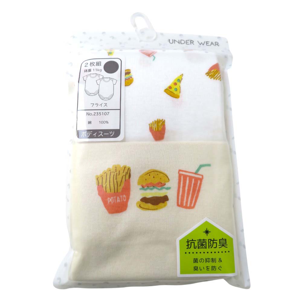 柔らかくて快適なフライス生地。伸縮があり動きやすい。デリケートなお肌に触れないよう洗濯ネーム外付け。ハンバーガー、ポテト柄。