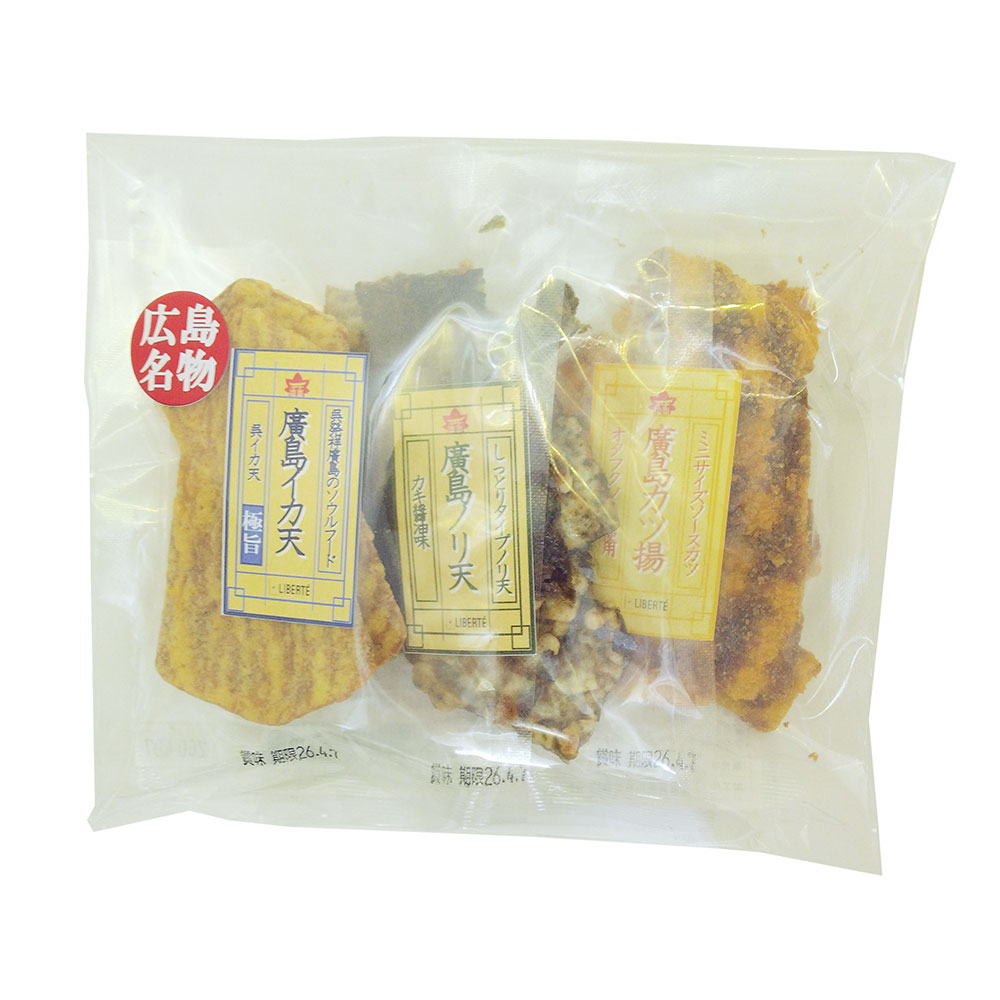 廣島イカ天三枚、廣島カツ揚45g、廣島ノリ天カキ醤油30g