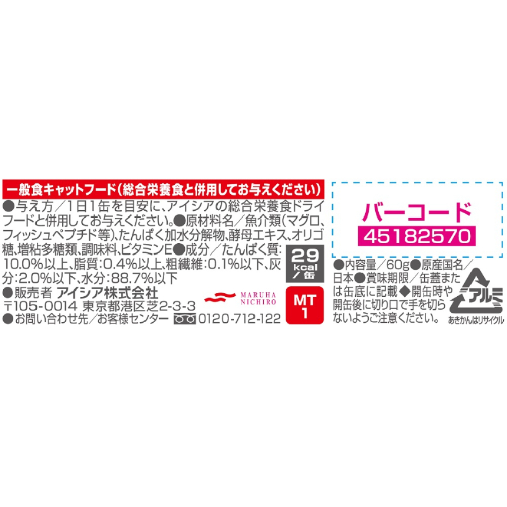まぐろをぜいたくに使用した国産品。猫がとびつくおいしさにこだわって、旨味エキスやa-iペプチドを絶妙なバランスで配合。お部屋で暮らす愛猫の心の健康維持にも配慮。