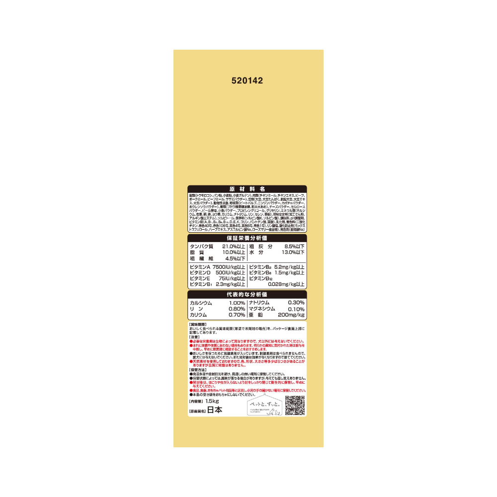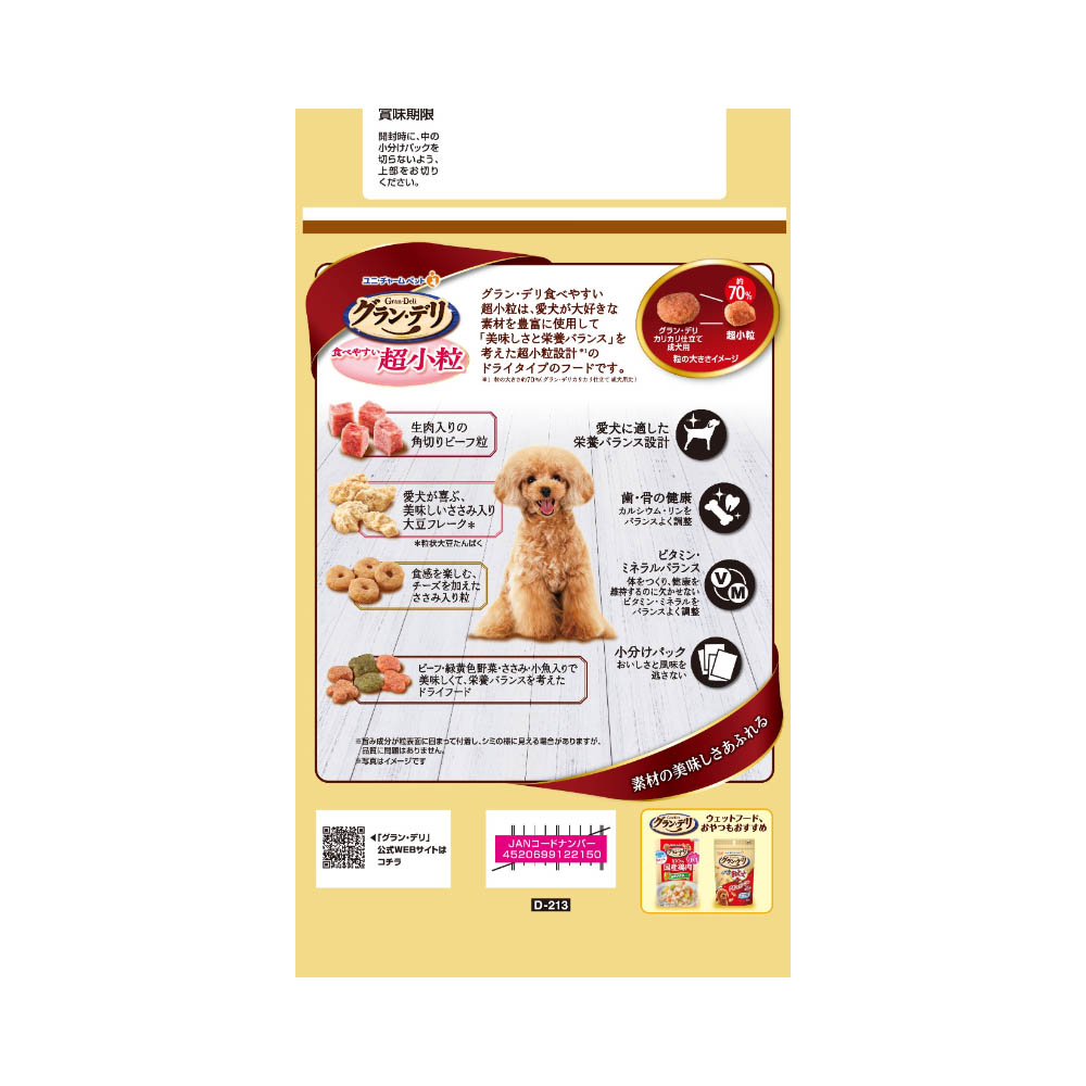 愛犬が大好きな素材を豊富に使用しました。グルメなわんちゃんにぴったりな美味しいドライフード。口の小さなワンちゃんでも食べやすい超小粒タイプ。※粒の大きさ約70%(グラン・デリカリカリ仕立て成犬用比)食感を楽しむ、チーズを加えたささみ入り粒たっぷり・生肉入りの角切りビーフ粒入り・ささみ入りの大豆フレーク入り・成犬用総合栄養食。必要な栄養素は生物によって異なりますので、犬以外には与えないでください。まれに体調や体質にあわない場合もあります。何らかの異常に気付かれた時は給与を中断し、早めに獣医師に相談することをおすすめします。おいしさを保つために脱酸素剤が入っています。脱酸素剤は食べられませんので、愛犬には与えないでください。また開封後は効果がなくなりますので捨ててください。天然素材を使用しておりますので、色、形状、大きさ等多少ばらつきがあることがありますが品質に問題はありません。高温多湿や直射日光を避け、風通しの良い場所に保管してください。保管状態によっては、風味が落ちる場合がありますが、与えても差し支えありません。開封後は、ほこりや虫が入らないよう封をしっかり閉じて衛生的に保管し、早めに与えてください。食品、食器、おもちゃ、ペット用品等と区別し、小児の手の届かない場所に保管してください。本品の空き袋をおもちゃにしないでください。