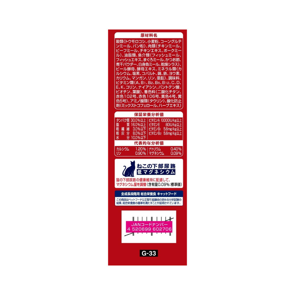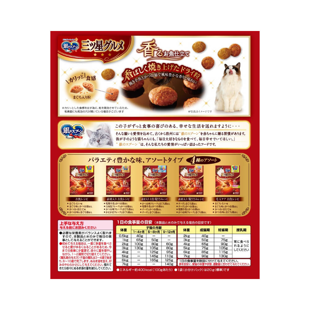 贅沢な素材の旨みたっぷりで、香ばしく焼き上げた三ツ星のおいしさ・カリッと食感の粒が入って、色々な食感が楽しめます。抜群のおいしさと優れた栄養バランスを実現した全成長段階用総合栄養食・猫の下部尿路の健康維持に配慮して、マグネシウム量を調整。(含有量:0.09%:標準値)おいしさと豊かな風味を逃さない、食べきり小分けパック20g(標準)×12袋。猫専用の栄養設計ですので、猫以外には与えないでください。まれに体質や体調に合わない場合もあります。何らかの異常に気付かれた時は給与を中断し、早めに獣医師に相談することをおすすめします。天然の原材料を使用しているため、色や形状などにばらつきがみられることがありますが、品質に問題はありません。旨み成分が固まったり、粒などに付着してシミのように見える場合がありますが、品質に問題はありません。直射日光や高温多湿を避け、小児の手が届かない、涼しく、風通しのよい場所に保管してください。開封後は、虫などが入らないように密閉して衛生的に保管し、早めにお使いください。本品の空き袋をおもちゃにしないでください。