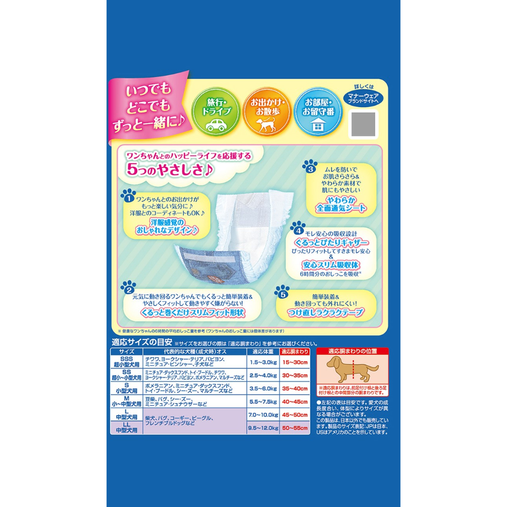 お出かけ、お部屋でのマーキングやそそうに!旅行、ドライブ、お散歩に。洋服感覚、おしゃれなデニム柄。「くるっと巻くだけスリムフィット形状」で、簡単装着&嫌がらない。「やわらか全面通気シート」で、お肌さらさら。「ぐるっとぴたりギャザー」で、モレ安心。「安心スリム吸収体」で、6時間分のおしっこを吸収。※健康なワンちゃんの6時間の平均おしっこ量を参考(ワンちゃんのおしっこ量には個体差があります)。