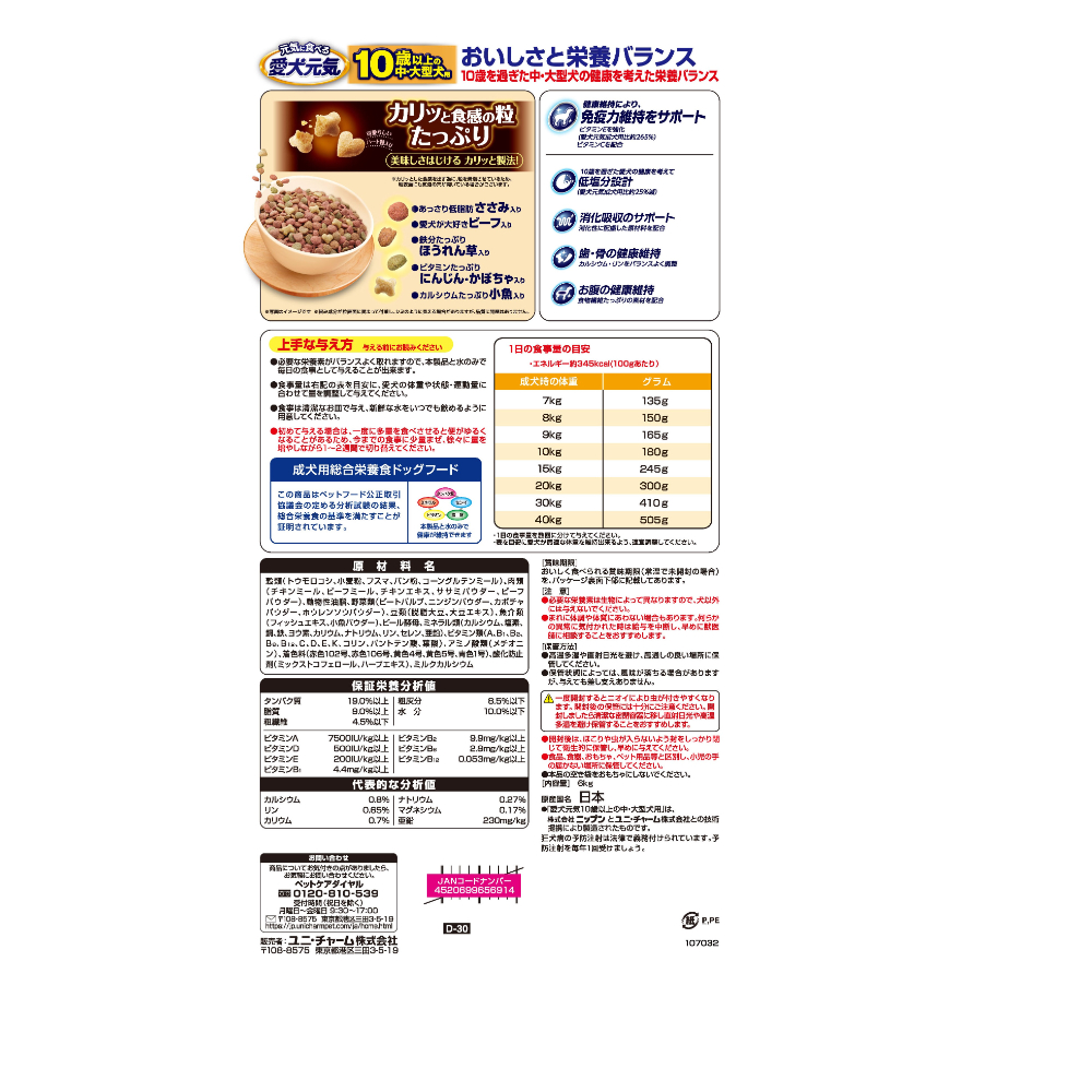 10歳を過ぎた愛犬の健康を考えた栄養バランス。成犬用総合栄養食。健康維持により、免疫力維持をサポートビタミンEを強化(愛犬元気成犬用比約265%)、ビタミンCを配合。10歳を過ぎた愛犬の健康を考えて低塩分設計(愛犬元気成犬用比約25%減)。消化性に配慮した原材料を配合。歯・骨の健康維持にカルシウム・リンをバランスよく調整。お腹の健康維持食物繊維たっぷりの素材を配合。