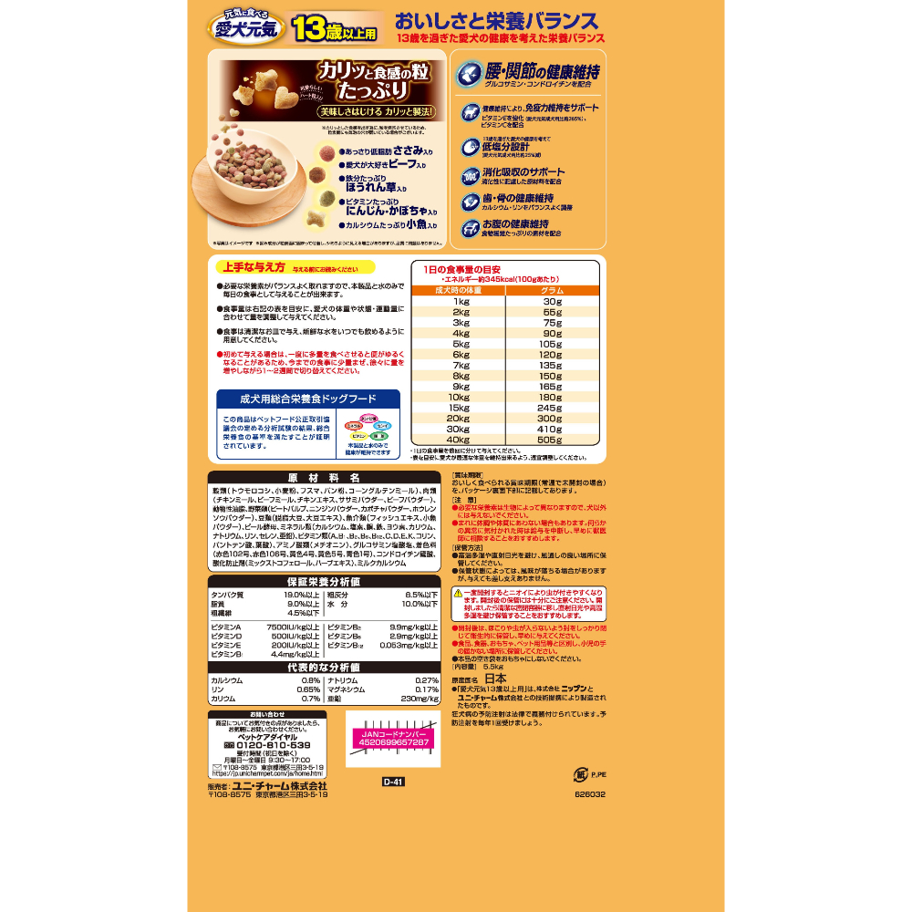 13歳を過ぎた愛犬の健康を考えた栄養バランス。成犬用総合栄養食。健康維持により、免疫力維持をサポートビタミンEを強化(愛犬元気成犬用比約265%)、ビタミンCを配合。13歳を過ぎた愛犬の健康を考えて低塩分設計(愛犬元気成犬用比約25%減)。消化性に配慮した原材料を配合。歯・骨の健康維持にカルシウム・リンをバランスよく調整。お腹の健康維持食物繊維たっぷりの素材を配合。