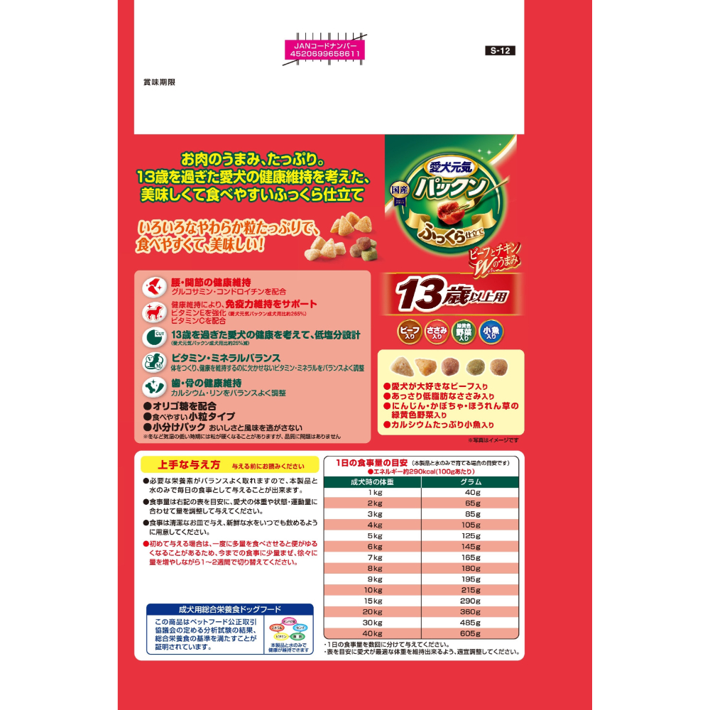 やわらかくて食べやすいふっくら仕立て。腰、関節の健康維持にグルコサミン、コンドロイチンを配合。健康維持により、免疫力維持をサポートビタミンEを強化(愛犬元気パックン成犬用比約265%)、ビタミンCを配合。13歳を過ぎた愛犬の健康を考えて低塩分設計(愛犬元気パックン成犬用比約25%減)。食べやすい小粒タイプ。ビーフ、ささみ、緑黄色野菜、小魚入り。
