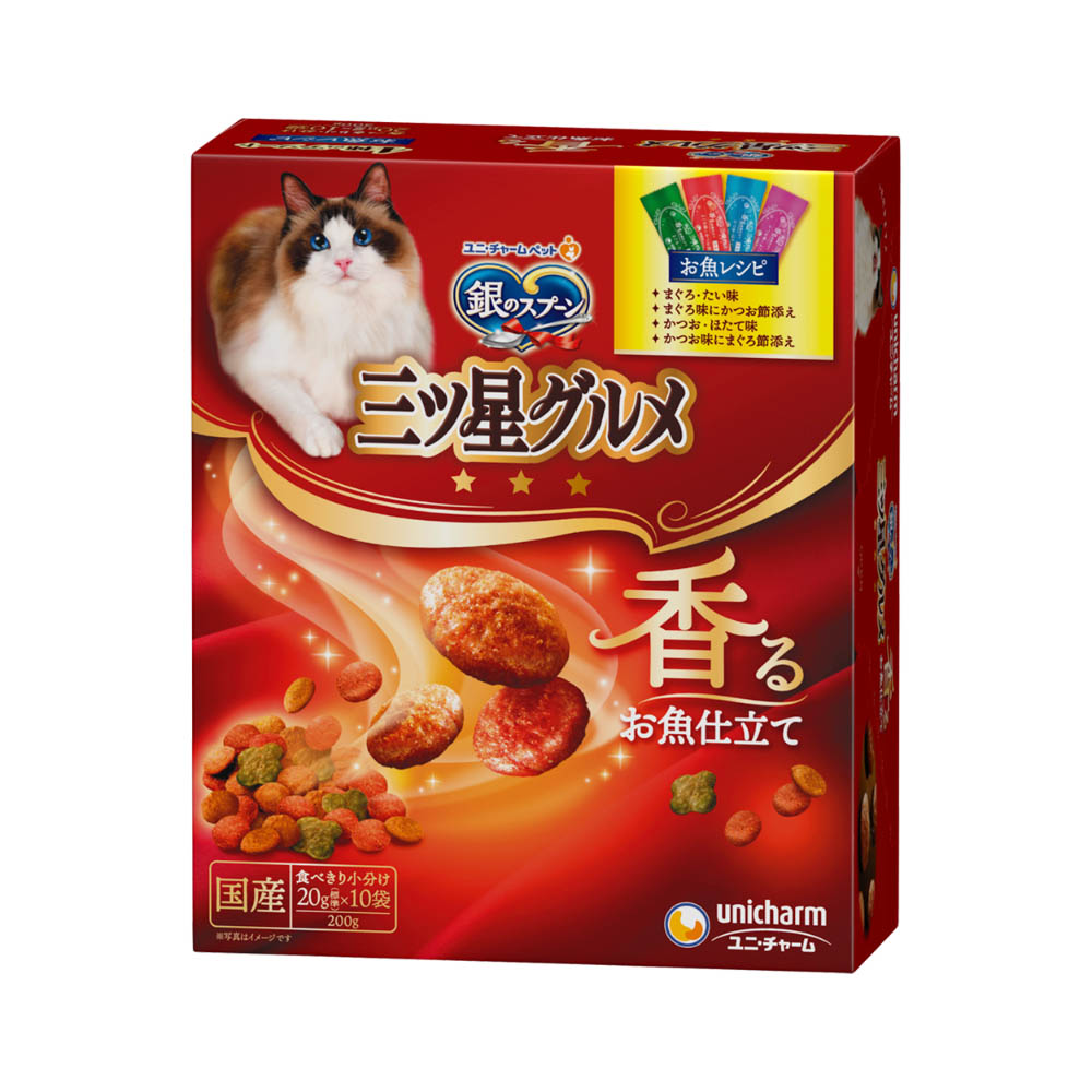 猫ちゃんが喜ぶお魚のおいしさがひと箱に4種類詰まった贅沢な逸品。カリッと食感の粒が入って、色々な食感が楽しめます。抜群のおいしさと優れた栄養バランスを実現した全成長段階用総合栄養食。猫の下部尿路の健康維持に配慮して、マグネシウム量を調整。(含有量:0.09%:標準値)おいしさと豊かな風味を逃さない、食べきり小分けパック20g(標準)×10袋。猫専用の栄養設計ですので、猫以外には与えないでください。まれに体質や体調に合わない場合もあります。何らかの異常に気付かれた時は給与を中断し、早めに獣医師に相談することをおすすめします。天然の原材料を使用しているため、粒の色や形状、素材の大きさや数にばらつきがみられることがありますが、品質に問題はありません。血合い部分が黒く見えることがあります。旨み成分が固まったり、粒などに付着してシミのように見える場合がありますが、品質に問題はありません。直射日光や高温多湿を避け、小児の手が届かない、涼しく、風通しのよい場所に保管してください。開封後は、虫などが入らないように密閉して衛生的に保管し、早めにお使いください。本品の空き袋をおもちゃにしないでください。