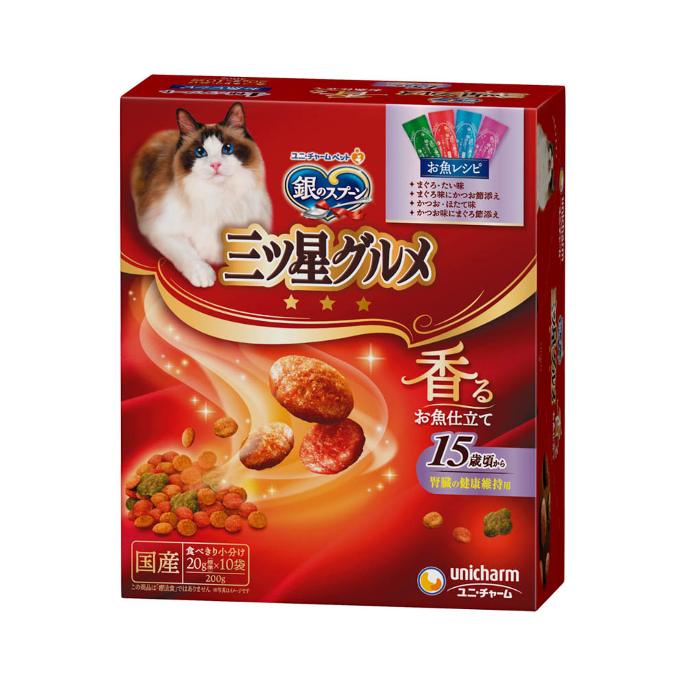 猫ちゃんが喜ぶお魚のおいしさがひと箱に4種類詰まった贅沢な逸品。腎臓の健康維持に配慮して、リンを制限した栄養設計。腎臓の健康維持に配慮して、ナトリウムの含有量を調整。オリゴ糖配合・ビタミンE強化で健康維持により、免疫力を保ちます。猫の下部尿路の健康維持に配慮して、マグネシウム量を調整。(含有量0.08%:標準値)※銀のスプーン三ツ星グルメ全成長段階用比猫専用の栄養設計ですので、猫以外には与えないでください。まれに体質や体調に合わない場合もあります。何らかの異常に気付かれた時は給与を中断し、早めに獣医師に相談することをおすすめします。天然の原材料を使用しているため、粒の色や形状、素材の大きさや数にばらつきがみられることがありますが、品質に問題はありません。血合い部分が黒く見えることがあります。旨み成分が固まったり、粒などに付着してシミのように見える場合がありますが、品質に問題はありません。直射日光や高温多湿を避け、小児の手が届かない、涼しく、風通しのよい場所に保管してください。開封後は、虫などが入らないように密閉して衛生的に保管し、早めにお使いください。本品の空き袋をおもちゃにしないでください。