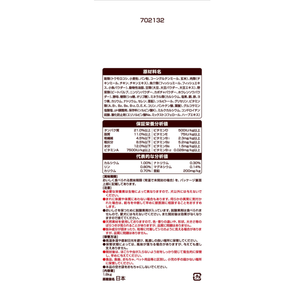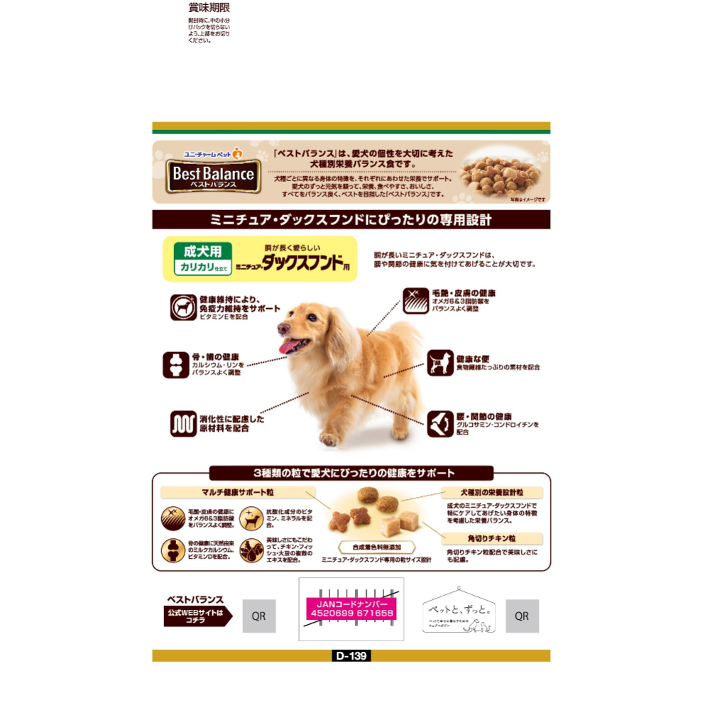 ミニチュア・ダックスフンドに合わせた専用設計。腰、関節の健康のためにグルコサミン、コンドロイチンを配合。ビタミンE配合で健康維持により免疫力維持をサポート。骨、歯の健康維持のために、カルシウム、リンをバランスよく調整。毛艶、皮膚の健康のためにオメガ6&3脂肪酸をバランスよく調整。消化性に配慮した原材料を配合。健康な便に配慮して食物繊維たっぷりの素材を配合。