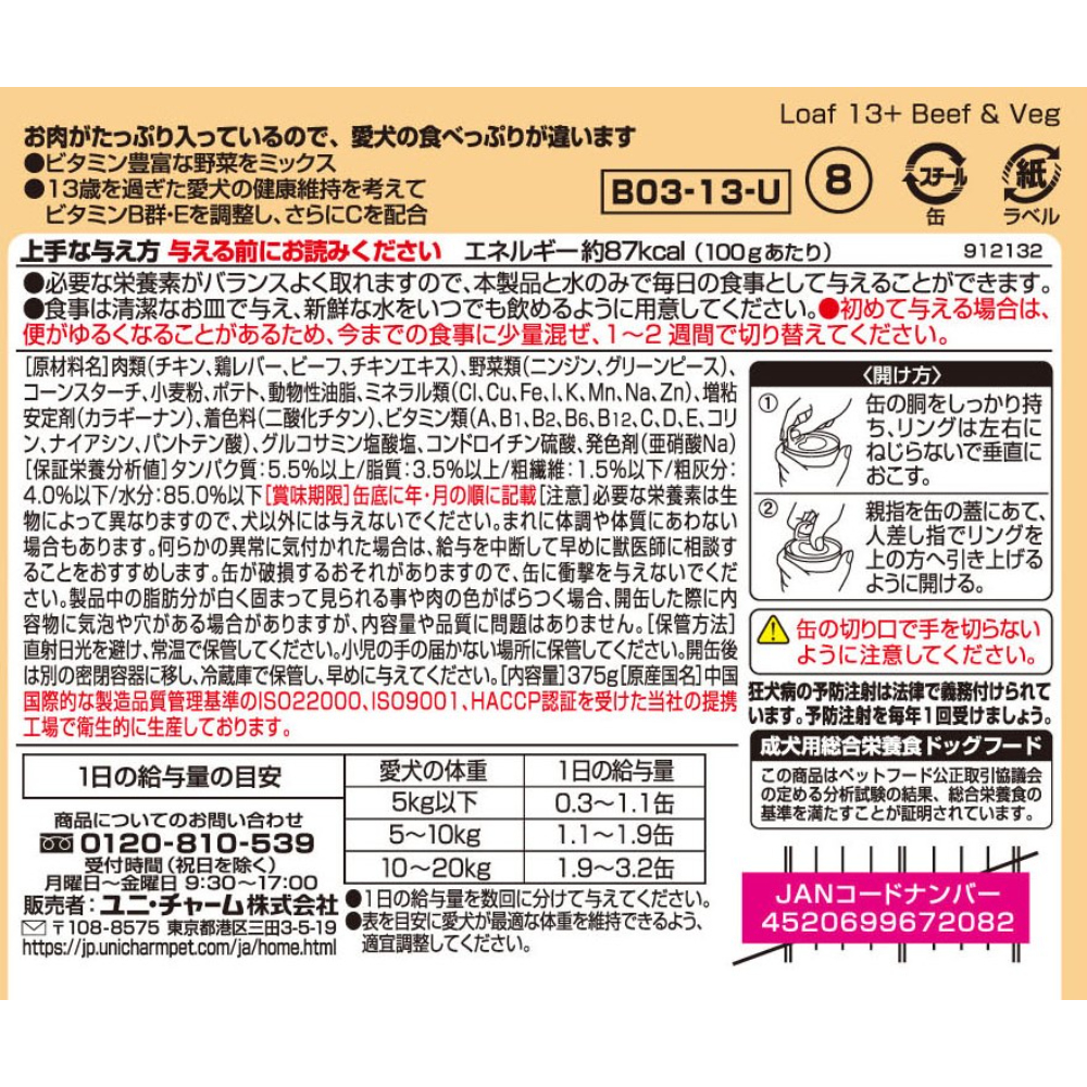 お肉がたっぷり入っているので、愛犬の食べっぷりが違います。13歳からの愛犬の健康維持を考えて、ビタミンB群。Eを調整、さらにビタミンCを配合。総合栄養食なので、愛犬に必要な栄養素をバランスよく摂取できます。ビーフに緑黄色野菜入り
