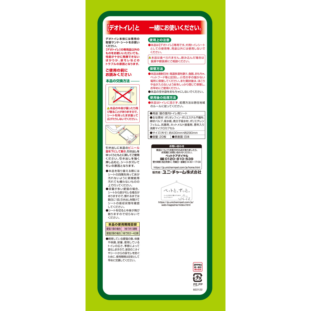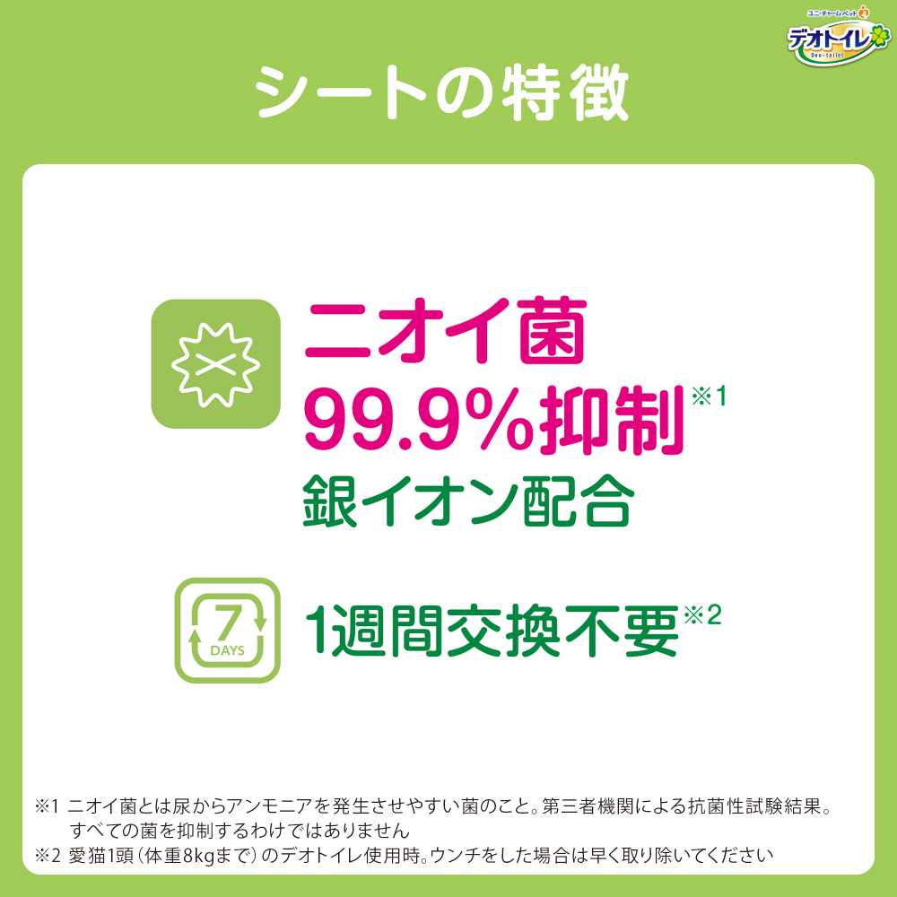 1週間分の尿をしっかり吸収し、抗菌剤がニオイを強力に抑えます。※愛猫1頭(体重8kgまで)の場合。ウンチをした場合は早く取り除いてください。銀イオン配合。ニオイ菌99.9%抑制※第三者機関による消臭。抗菌シートの抗菌性試験結果。すべての菌を抑制するわけではありません。消臭マイクロカプセル配合で強力消臭。シート表面が白いので、オシッコの色がわかりやすく、チェックしやすい。