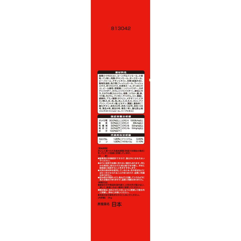 サクサクおいしい食感のかつおだし入り粒とまぐろのうまみ入り粒が入ってとびつくおいしさ。おいしさと栄養バランスを考えた総合栄養食。体をつくり、健康を維持するのに欠かせないビタミン、ミネラルをバランス良く調整。まぐろ・白身魚・チキン・緑黄色野菜入り。