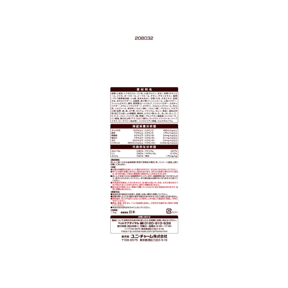 13歳以上のミニチュア・ダックスフンドに合わせた専用粒サイズ設計。腰・関節の健康維持のために、グルコサミン・コンドロイチンを強化。消化性に配慮した原材料を配合。骨・歯の健康維持のために、カルシウム・リンをバランスよく調整。皮膚・毛艶の健康維持のために、オメガ6&3脂肪酸をバランスよく調整。ビタミンE強化で、健康維持により免疫力維持をサポート。必要な栄養素は生物によって異なりますので、犬以外には与えないでください。まれに体調や体質にあわない場合もあります。何らかの異常に気付かれた場合は、給与を中断して早めに獣医師に相談することをおすすめします。おいしさを保つために脱酸素剤が入っています。脱酸素剤は食べられませんので、愛犬には与えないでください。また開封後は効果がなくなりますので捨ててください。天然素材を使用しておりますので、色・香りの違いや、形状、大きさ等のばらつきが見られることがありますが、品質に問題はありません。旨み成分が固まったり、粒等に付着してシミのように見える場合がありますが、品質に問題はありません。高温多湿や直射日光を避け、風通しの良い場所に保管してください。保管状態によっては、風味が落ちる場合がありますが、与えても差し支えありません。開封後は、ほこりや虫が入らないよう封をしっかり閉じて衛生的に保管し、早めに与えてください。食品、食器、おもちゃ、ペット用品等と区別し、小児の手の届かない場所に保管してください。本品の空き袋をおもちゃにしないでください。