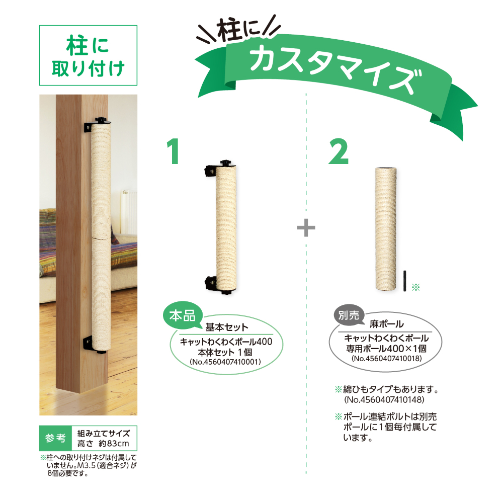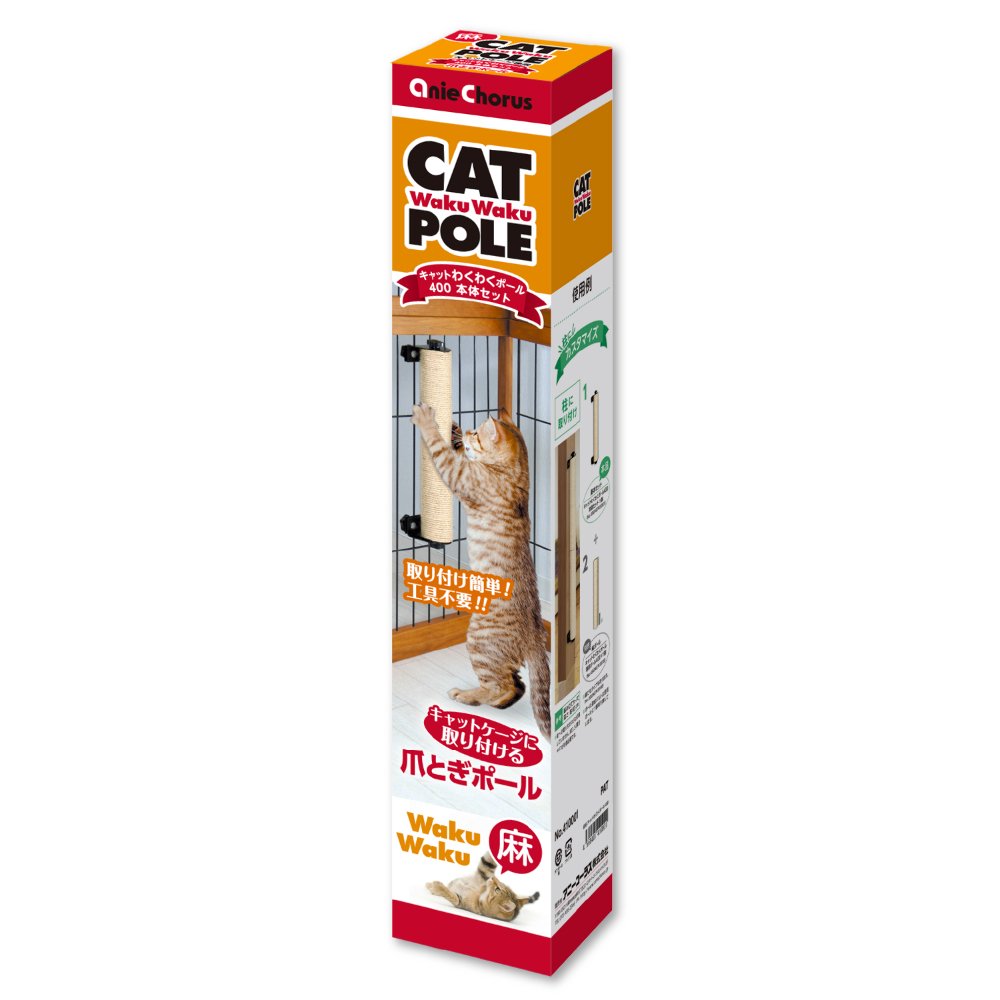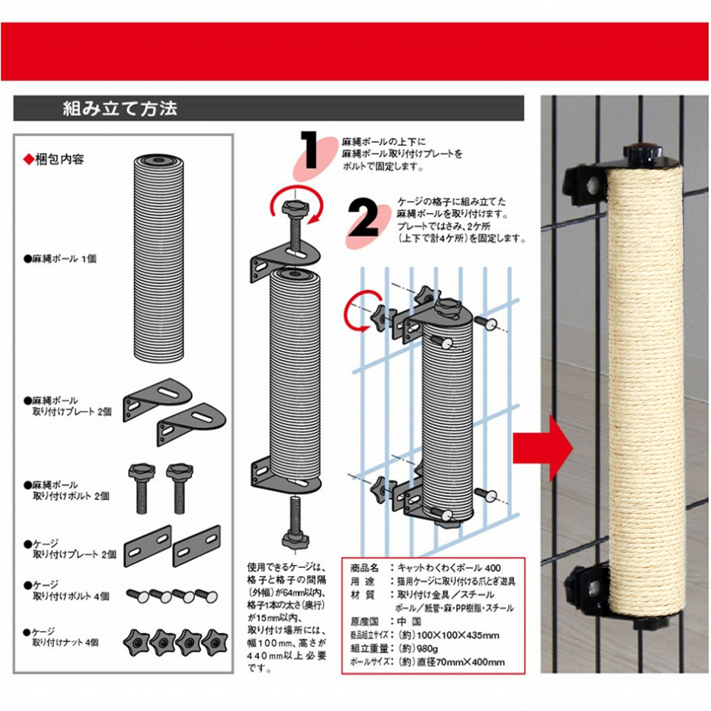 キャットケージ専用の爪とぎポールす。工具不要で高さも自由。ポールの脱着は上下のノブを回すだけ。留め具はスチール製で丈夫です。