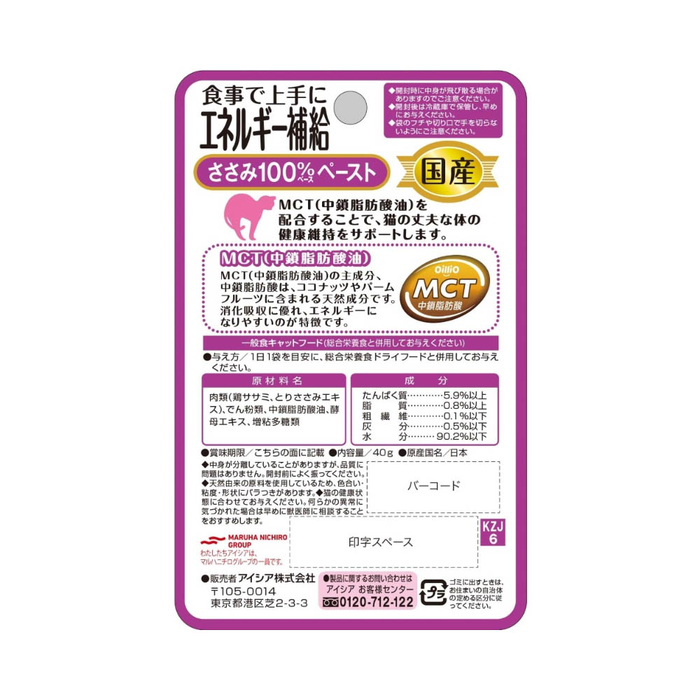 消化吸収に優れ、良質なエネルギーになりやすい中鎖脂肪酸油を配合。子猫からシニア猫まで食べやすいペーストタイプ。袋のフチや切り口で手を切らないようにご注意ください。開封時に中身が飛び散る場合がありますのでご注意ください。直射日光・高温多湿の場所は避けて、保存してください。
