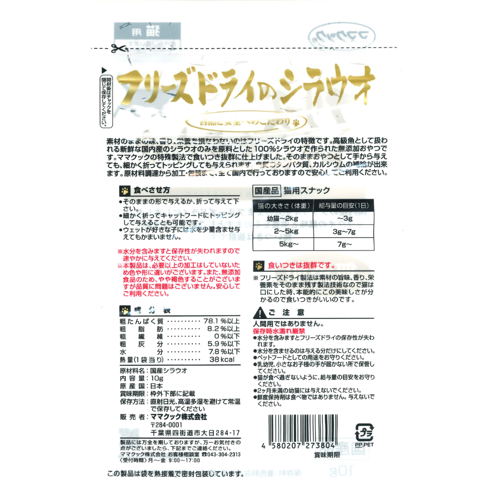 高級魚の国産シラウオのみを使用。 手からあげられるおやつにも、細かく折っていつものごはんのトッピングにも使えます。
