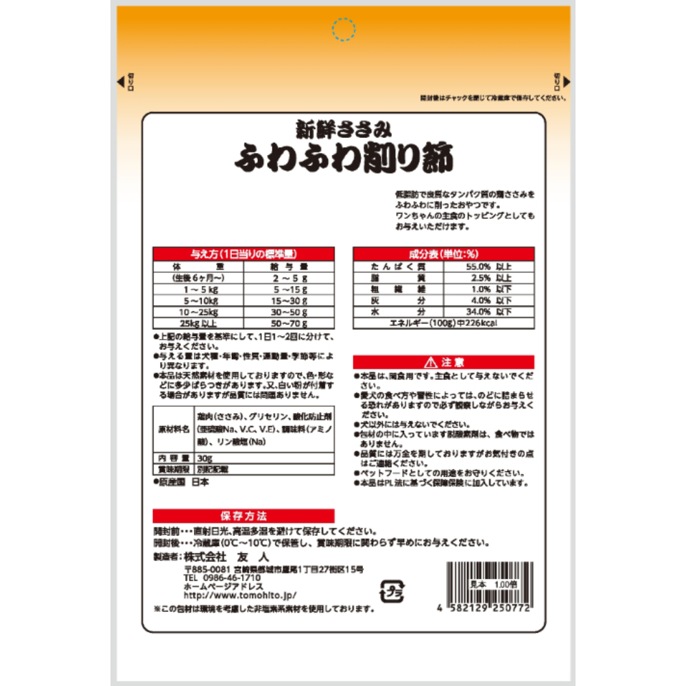 小麦粉を使用せず、ササミを丁寧に削って作ったササミの削り節です。