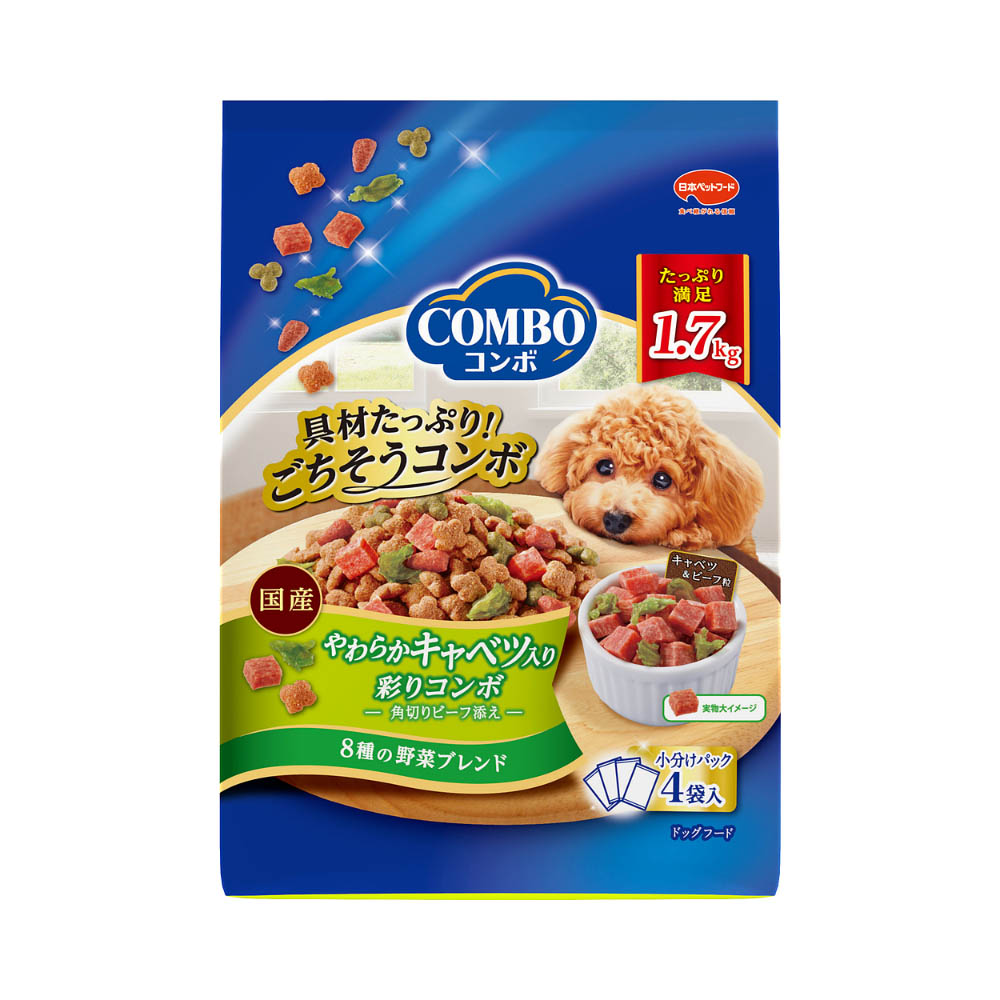 具材たっぷりごちそうコンボ!キャベツ&ビーフ粒入り体質や体調に合わない場合は、使用を中止し、獣医師にご相談ください。本商品は成犬以上が対象です。子犬(12ヵ月)には子犬用フードをお与えください。