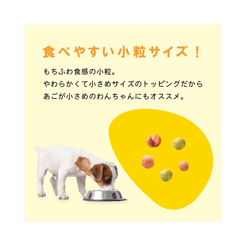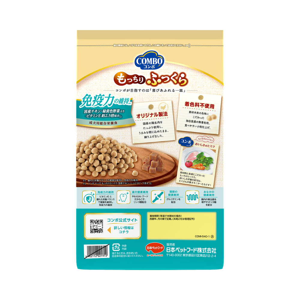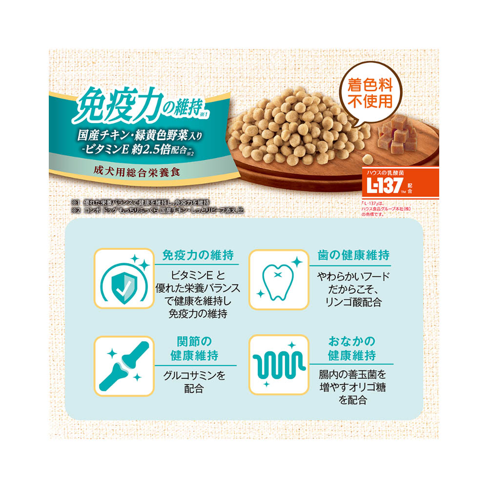 着色料不使用。国産鶏肉を使用したもちふわ粒にささみ粒をトッピング。優れた栄養バランスで免疫力を維持。与え方そのまま与えます。いつでも新鮮な水が飲めるようにしてください。(総合栄養食ですから、本商品と水だけで必要なすべての栄養をバランスよく摂ることができます。)本商品は成犬以上が対象です。子犬(12ヵ月まで)には子犬用フードをお与えください。このフードを食べるのが初めての時は、いままでの食事に少し混ぜてお与えください。毎日少しずつ増やし、10日くらいで切り替えてください。一度にたくさん与えすぎると便がゆるくなることがあります。缶詰などの副食、おやつ等をあげる場合は、カロリーオーバーにならないよう、フードの量を調節してください。犬専用に栄養バランスを調整しています。犬以外には与えないでください。直射日光・高温多湿を避け、冷暗所で保管してください。