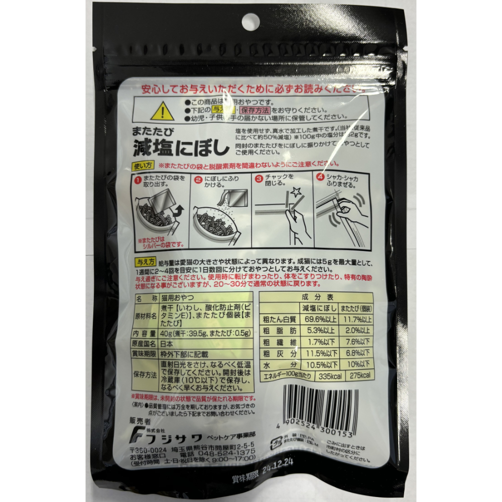 塩を使用せず、真水で加工した煮干です。当社、従来品に比べて約50%減塩。100g中の塩分は約2%です。