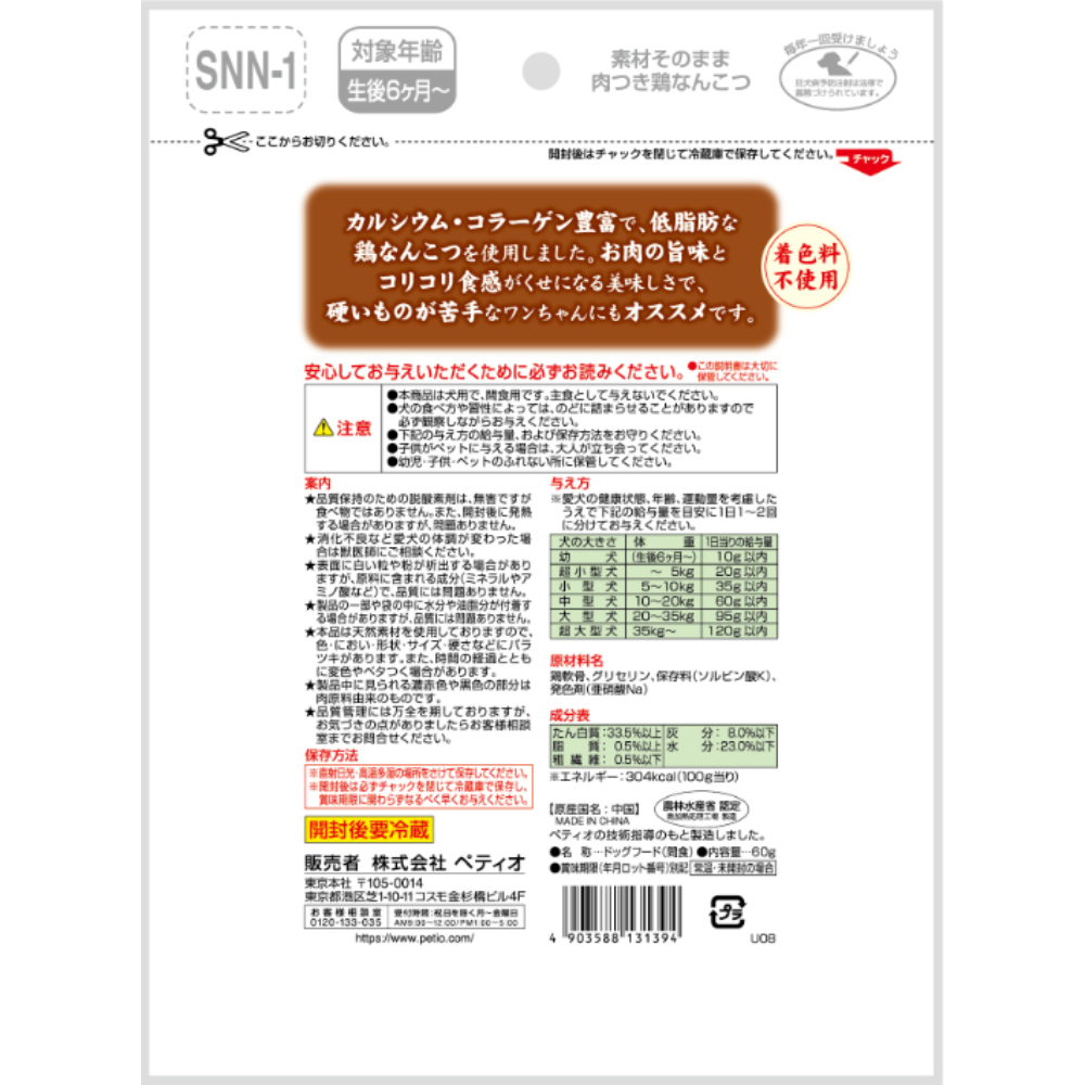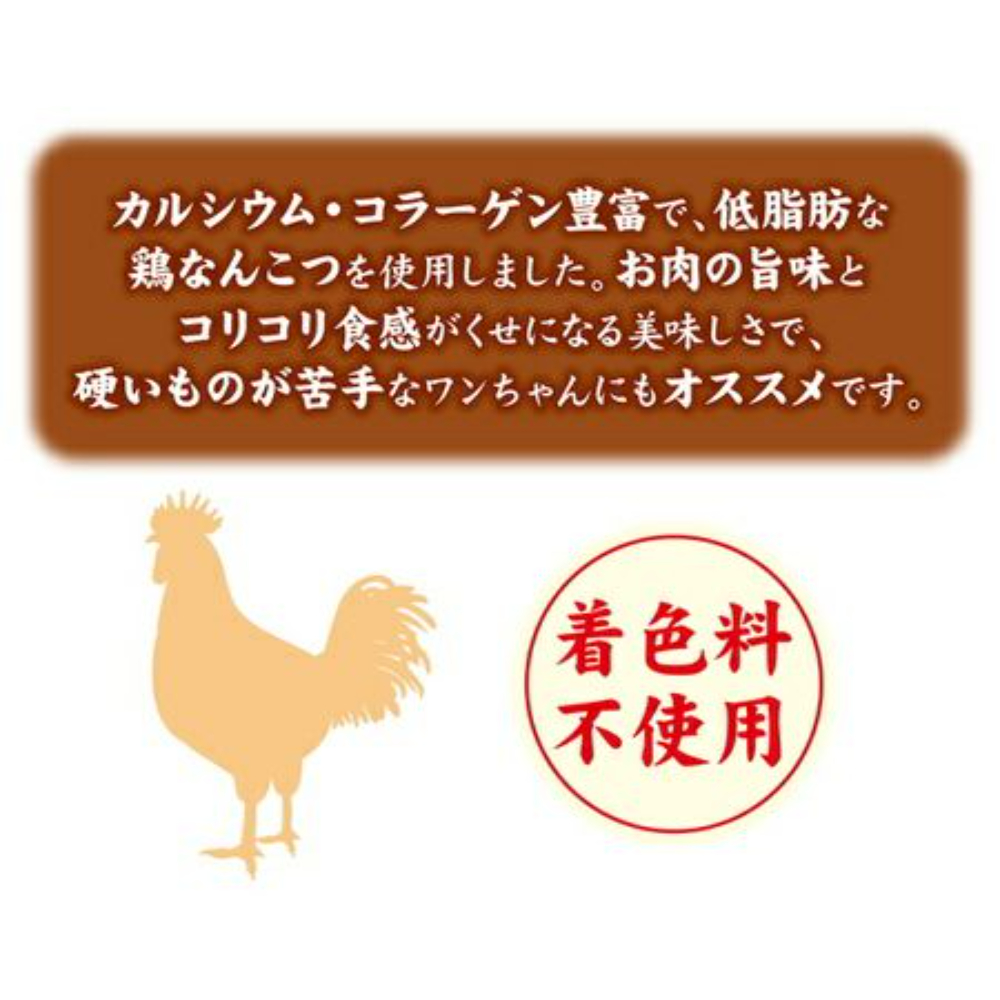 カルシウム・コラーゲン豊富で、低脂肪な鶏なんこつを使用しました。お肉の旨味とコリコリ食感がくせになる美味しさで、硬いものが苦手なワンちゃんにもオススメです。着色料不使用。農林水産省認定 鳥加熱処理工場製造。
