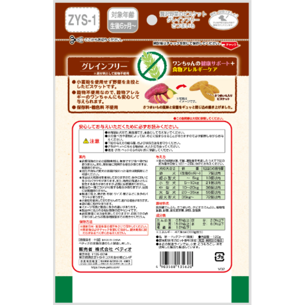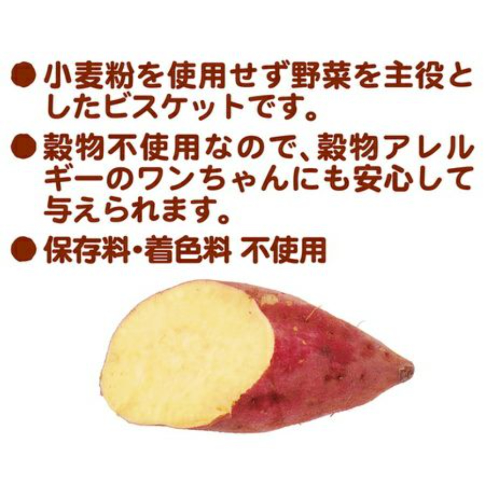 グレインフリーだからワンちゃんの健康サポート・食物アレルギーケアができる。さつまいもの風味と栄養をギュッと閉じ込め焼き上げました。保存料・着色料不使用。