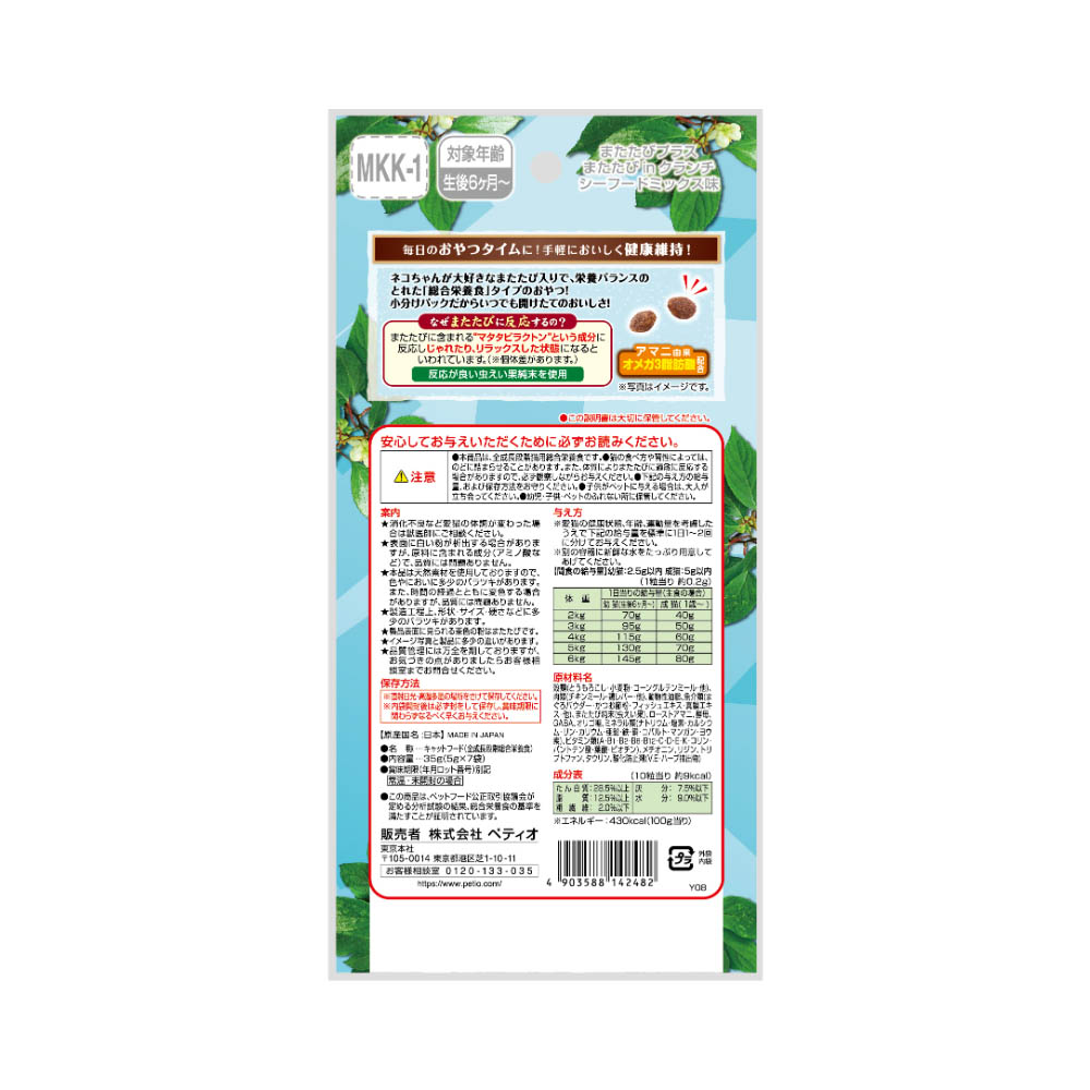 栄養満点なシーフードミックス味の小粒にまたたびをコーティングしたスナック。またたびの中でも反応が良い虫えい果の純末を使用。皮膚被毛の健康を維持するオメガ3脂肪酸を含むアマニ配合!さらに、いつでも開けたての美味しさが楽しめる小分けパック。本商品は、全成長段階猫用総合栄養食です。猫の食べ方や習性によっては、のどに詰まらせることがあります。また、体質によりまたたびに過敏に反応する場合がありますので、必ず観察しながらお与えください。本商品は、全成長段階猫用総合栄養食です。猫の食べ方や習性によっては、のどに詰まらせることがあります。また、体質によりまたたびに過敏に反応する場合がありますので、必ず観察しながらお与えください。別記の与え方の給与量、および保存方法をお守りください。子供がペットに与える場合は、大人が立ち会ってください。幼児子供ペットのふれない所に保管してください。