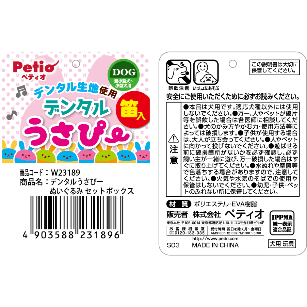 遊びながらハミガキ習慣!デンタル生地を使用したカラフルなうさぎのぬいぐるみ。お口の小さなワンちゃんにもくわえやすいサイズ。ワンちゃん大好きな笛入。