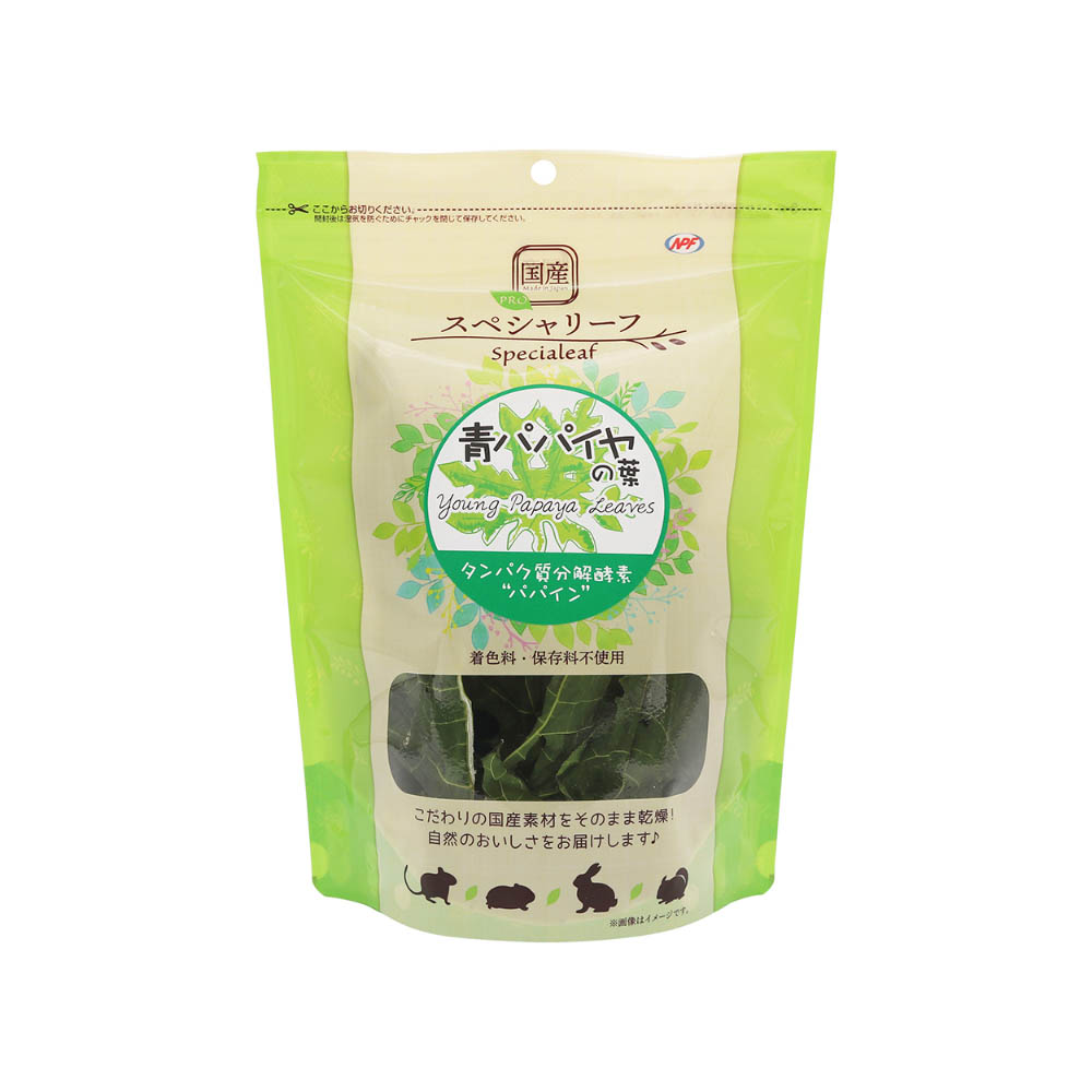 こだわりの国産素材。自然のおいしさをお届けします。タンパク質・脂質・糖質を分解する3つの酵素を含んだ“酵素の王様”青パパイヤの葉をそのまま乾燥!タンパク質分解酵素“パパイン”や豊富な食物繊維で毛玉ケア♪ポリフェノールやビタミン・ミネラル・アミノ酸など栄養豊富な青パパイヤの葉が毎日の健康をサポートします。本品はペットフードです。目的以外のご使用はおやめください。お子様が与えるときには安全確保のために大人の方が付き添ってください。自然素材を使用しているため、季節や原料事情等により大きさや形状、色、香り、硬さ、成分値などが異なる場合や葉に虫食い跡等がつく場合がございます。自然素材であるため、原材料以外の植物や夾雑物(虫・繭・土・石など)が付着・混入している場合がございます。選別作業時に十分注意し、異物除去作業を実施しておりますが、まれに商品に混入する場合がございます。ペットに与える際には十分ご注意いただき、あらかじめ取り除いてからご使用ください。品質管理には万全を期しておりますが、万一商品にお気づきの点がございましたら現品を袋ごとお送りください。送料はメーカー負担にてお取替えさせていただきます。賞味期限(開封前)欄外に記載(年.月で表示)直射日光、高温多湿をさけ涼しい場所に保管してください。開封後はできるだけ早くご使用ください。