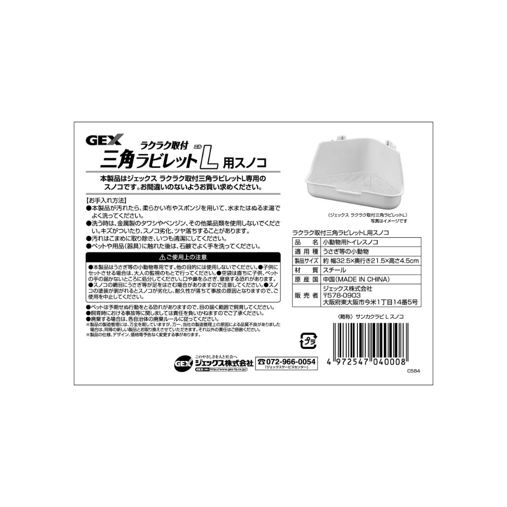 本製品はジェックスラクラク取付三角ラビレットL専用のスノコです。お間違いのないようお買い求めください。ペットや用品(器具)に触れた後は、石鹸でよく手を洗ってください。廃棄する場合は、各自治体の廃棄ルールにしたがってください。