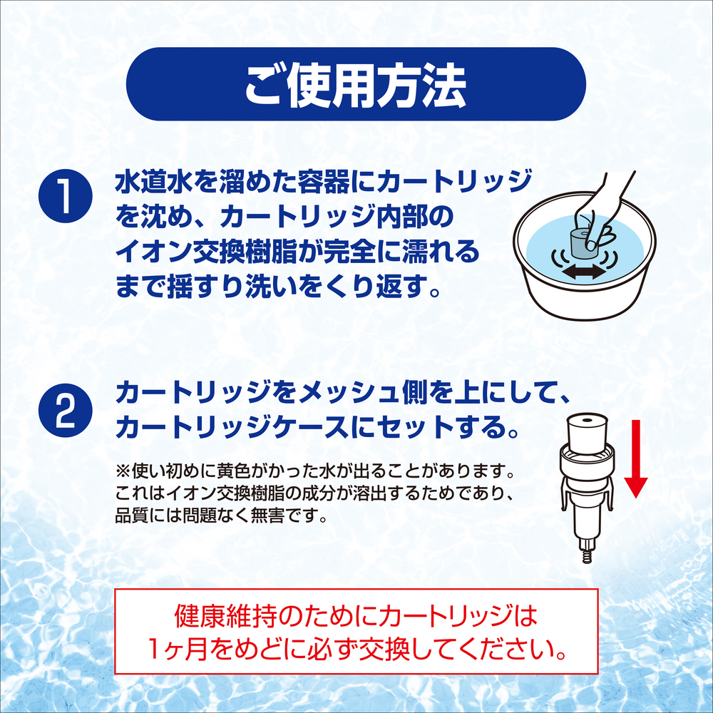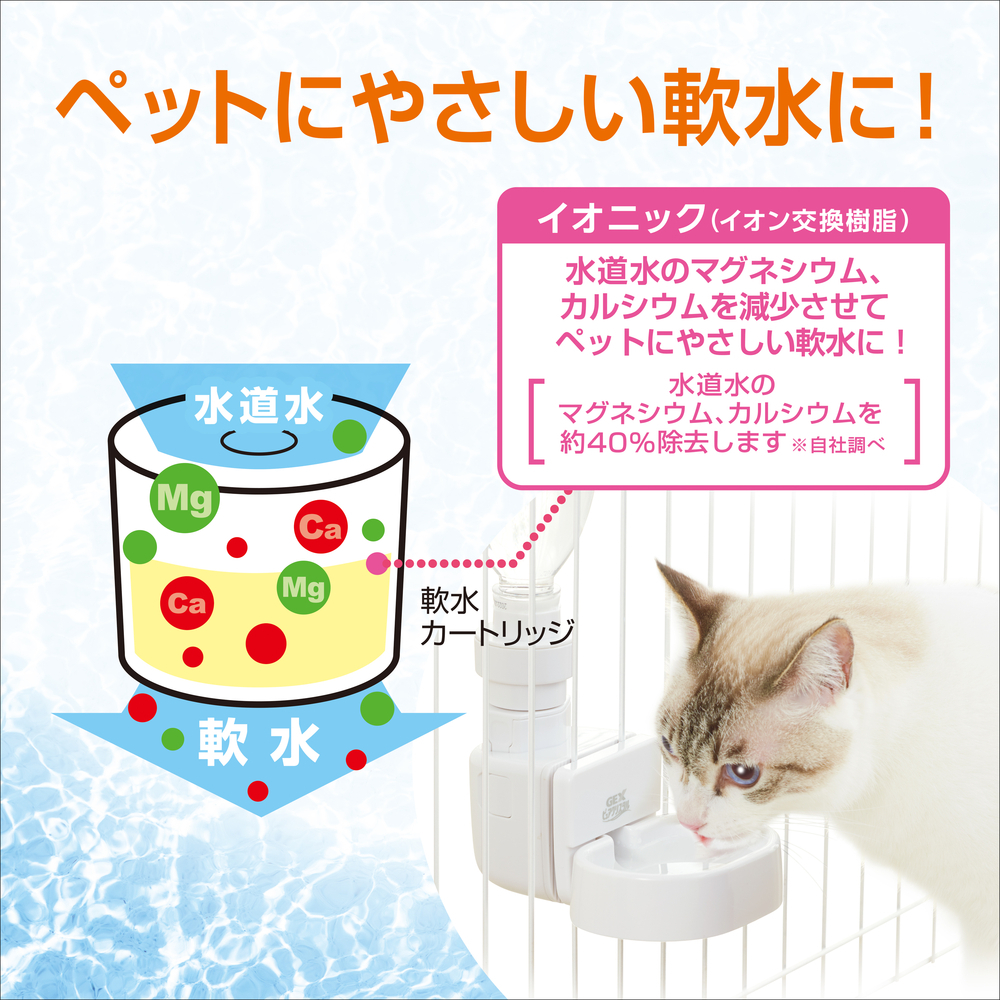 イオニック(イオン交換樹脂)が水道水のマグネシウム、カルシウムを除去して猫にやさしい水(軟水)に(水道水のマグネシウム、カルシウムを約40%除去します※メーカー調べ)。マグネシウム、カルシウムは動物にとって大切なミネラルですが、過剰摂取を防ぐことで下部尿路の健康に配慮できます。また、水分を多く取り、排尿の回数を増加させることが大切です。日ごろから食事、肥満、運動不足などにも注意が必要です。異常に気付いた場合は、早急に獣医師にご相談ください。この商品は、病気の治療等を目的としたものではありません。2個入(約2ヶ月分)。