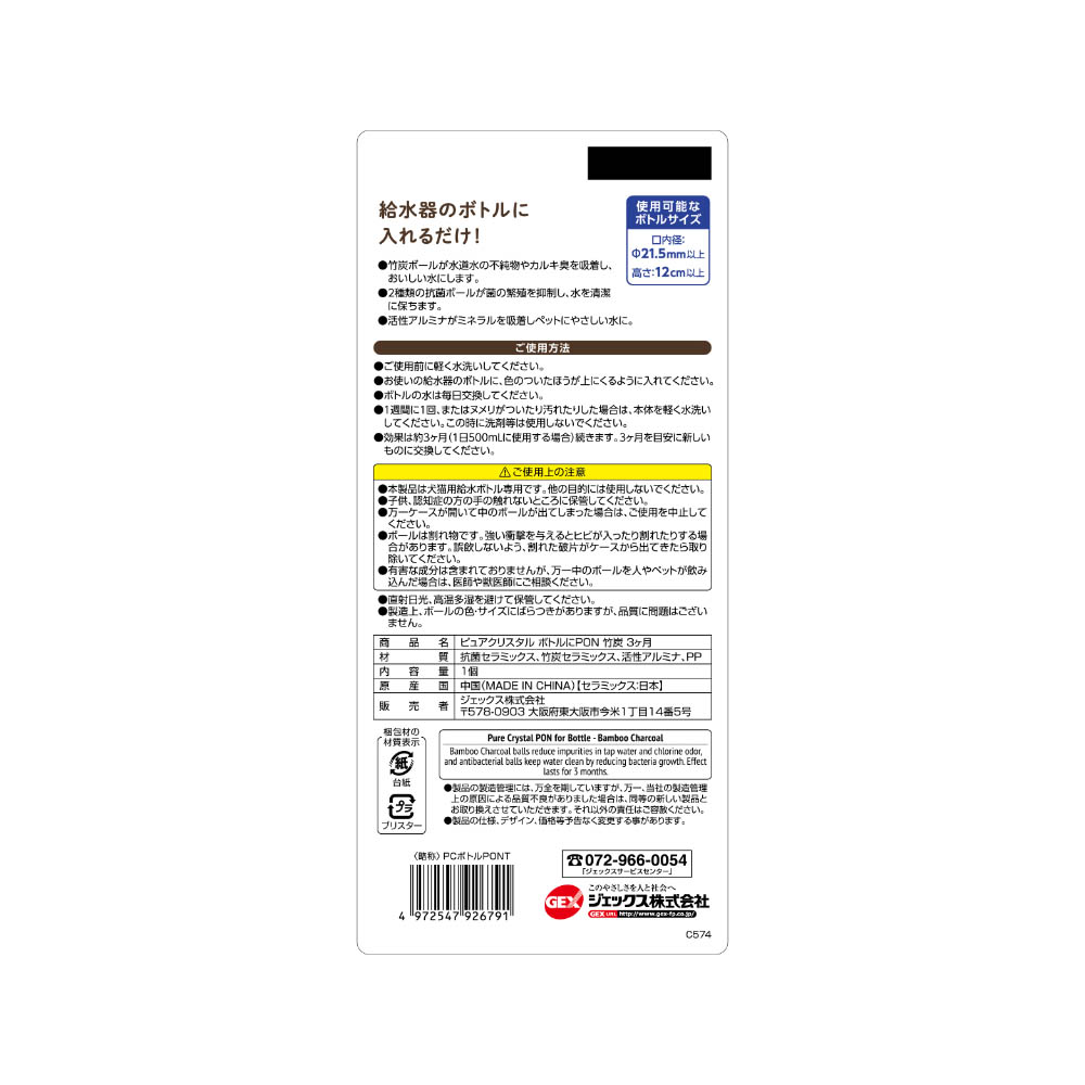 ジェックス ピュアクリスタル ボトルにPON 竹炭3ヶ月