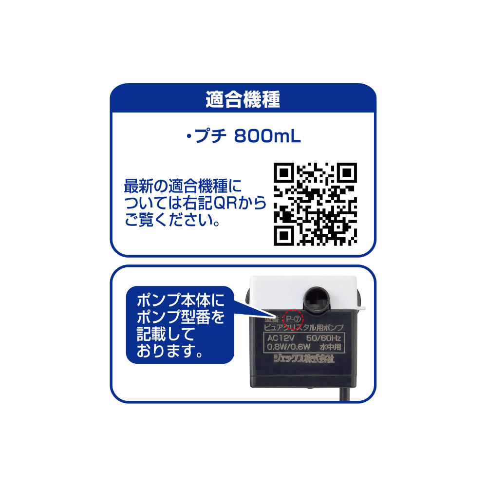フィルター式給水器ピュアクリスタルの交換用ポンプです。適合機種:プチ800mL最新の適合機種はジェックスHPよりご確認ください。使い続けていくと、ポンプのインペラー部にゴミ(被毛、フードカス等)や水アカがたまり、インペラーが回転しにくくなります。インペラーロックが起こり、水が循環しなくなる恐れがありますので、月に一度は点検・掃除をしてください。長期間お使いいただくと、インペラーのマグネットが劣化してポンプのパワーが弱くなってきます。1年に1度を目安に新しく交換することをおすすめします。廃棄する場合は、各自治体の廃棄ルールに従ってください。