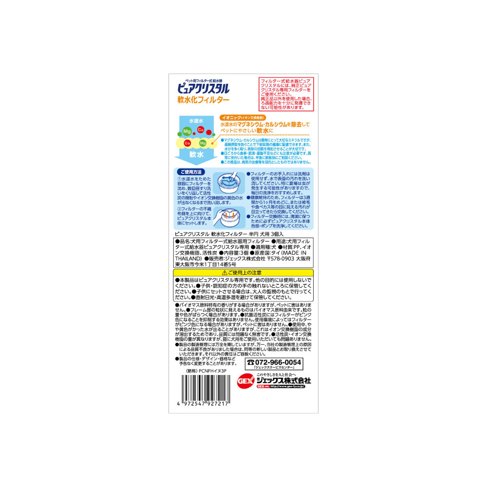 イオニック(イオン交換樹脂)が、水道水のマグネシウム・カルシウムを除去してペットにやさしい軟水にします。活性炭(抗菌活性炭配合)が、カルキ臭を吸着しおいしい水に。不織布で気になる食べカス、抜け毛、ホコリなどをキャッチして、キレイな水を維持します。健康維持のため、フィルターは3週間から1ヶ月をめどに、または被毛や食べカス等の目に見える汚れが目立ったときに交換してください。フィルター交換時には、清潔に保つために必ずピュアクリスタル本体各部、ポンプを洗浄してください。フィルター式給水器ピュアクリスタルには、GEX製ピュアクリスタル専用フィルターをご使用ください。この商品は、病気の治療等を目的としたものではありません。