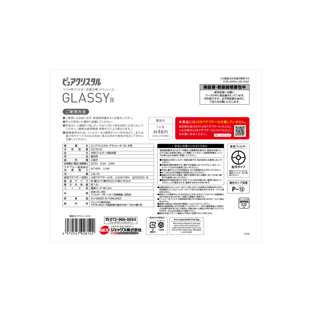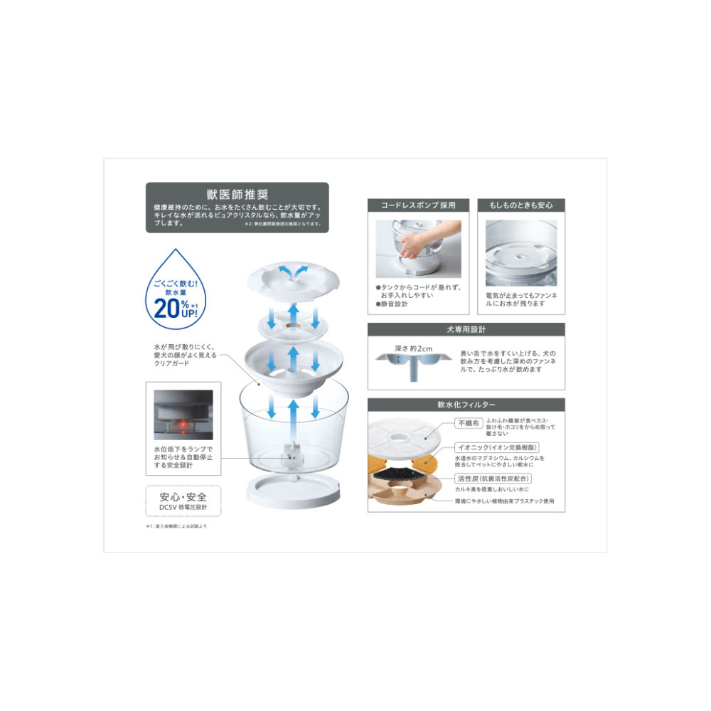 獣医師推奨:健康維持のために、お水をたくさん飲むことが大切です。キレイな水が流れるピュアクリスタルなら、飲水量がアップします。(メーカー顧問獣医師の推奨となります)コードレスポンプ採用:タンクからコードが垂れず、お手入れしやすいもしものときも安心:電気が止まってもファンネルにお水が残ります犬専用設計:長い舌で水をすくい上げる、犬の飲み方を考慮した深めのファンネルで、たっぷり水が飲めます。水が飛び散りにくく、愛犬の顔がよく見えるクリアガード水位低下をランプでお知らせ&自動停止する安全設計安心・安全DC5V低電圧設計軟水化フィルター付:下部尿路の健康維持に。本製品にはUSBアダプターは付属していません。GEX純正品(GEX「USBアダプターG―1A」)もしくは市販のUSBアダプター(DC5V/1A以上)をお買い求めください。廃棄する場合は、各自治体の廃棄ルールにしたがってください。