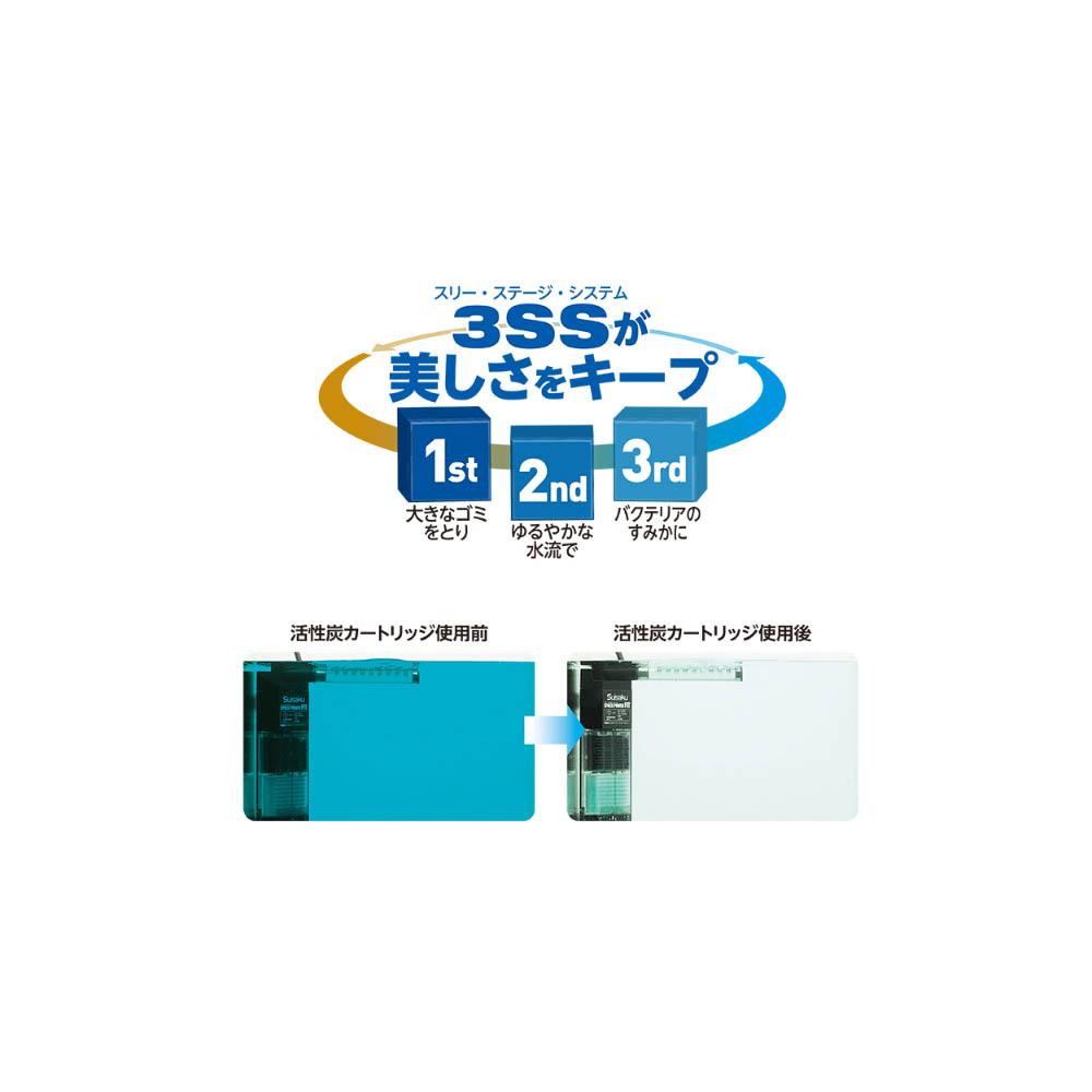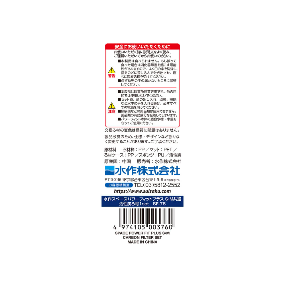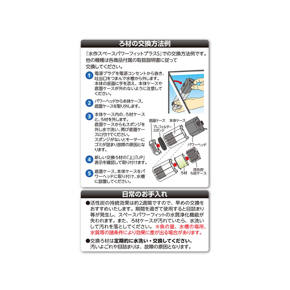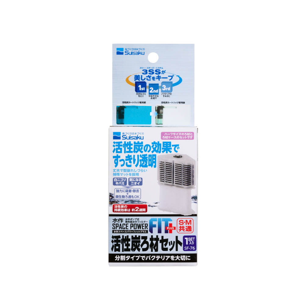 特殊素材の三層構造マット(ハーフサイズ1個)と嫌なニオイや黄ばみを吸着する活性炭ろ材のセット、水作スペースパワーフィットシリーズS/M共通、1セット入り。使用中に破損・変形・劣化が見られた場合は、直ちに使用を中止してください。本製品は観賞魚及び水棲生物飼育専用につき、他の目的で使用しない事。セット時や魚の出し入れ、点検掃除等水中に手を入れる時は全ての電源を切る事。魚病薬を使用する際は活性炭メッシュケースを外して使用する事。
