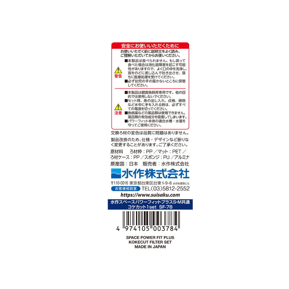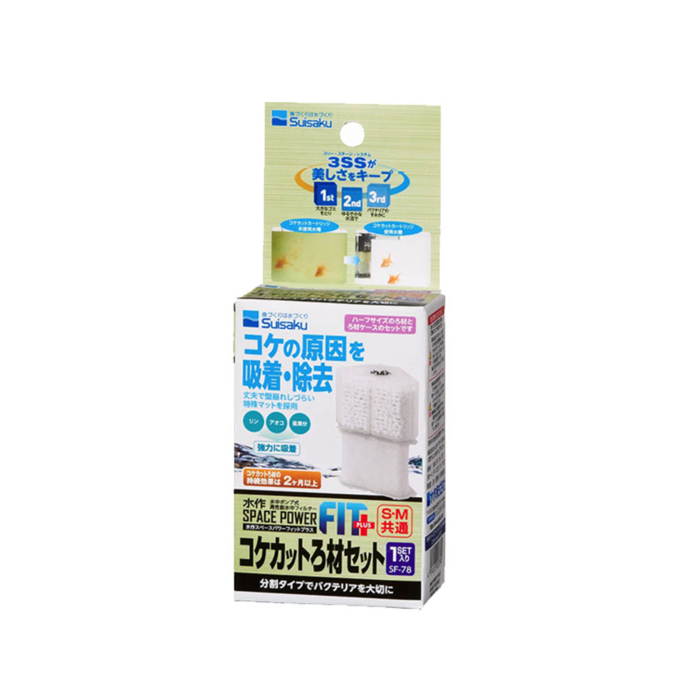 特殊素材の三層構造マット(ハーフサイズ1個)とコケやアオコの発生を抑制するコケカットろ材のセット、水作スペースパワーフィットシリーズS/M共通、1セット入り。使用中に破損・変形・劣化が見られた場合は、直ちに使用を中止してください。本製品は観賞魚及び水棲生物飼育専用につき、他の目的で使用しない事。セット時や魚の出し入れ、点検掃除等水中に手を入れる時は全ての電源を切る事。