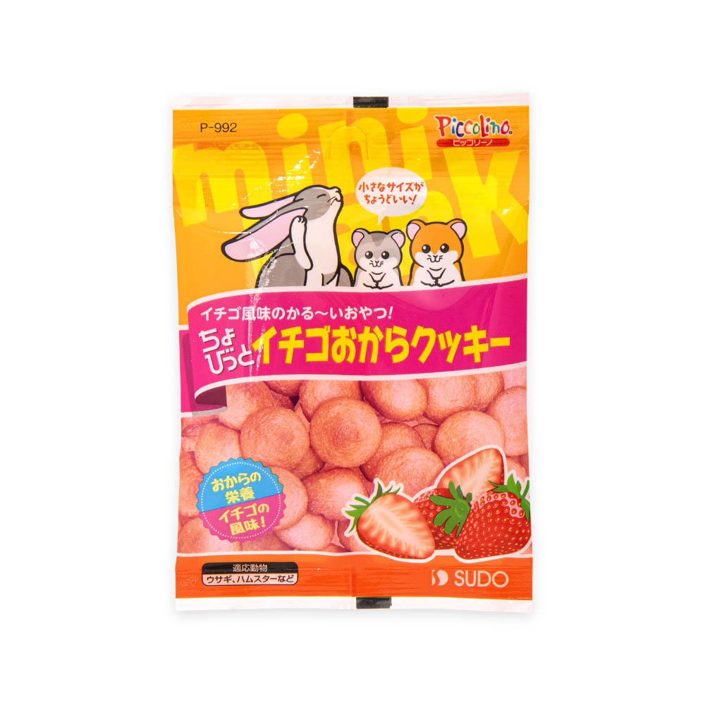 おからの栄養とイチゴの風味がベストマッチ!うさぎやハムスターたちが大好きなかる~いおやつです。対象動物の種類・年齢・体重・健康状態に合わせ、給与量の目安を参考に調整してください。当製品は小動物用フード(おやつ)ですこれ以外の目的に使用しないでください。高温多湿、直射日光を避け、涼しい場所に保管し、開封後は早めにお使いください。乳幼児の手の届かない場所に保管してください。袋に記載の賞味期限を確認の上、お求めください。