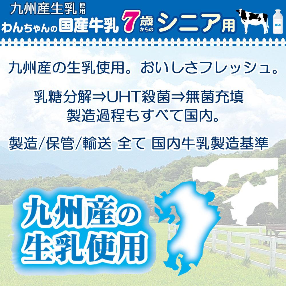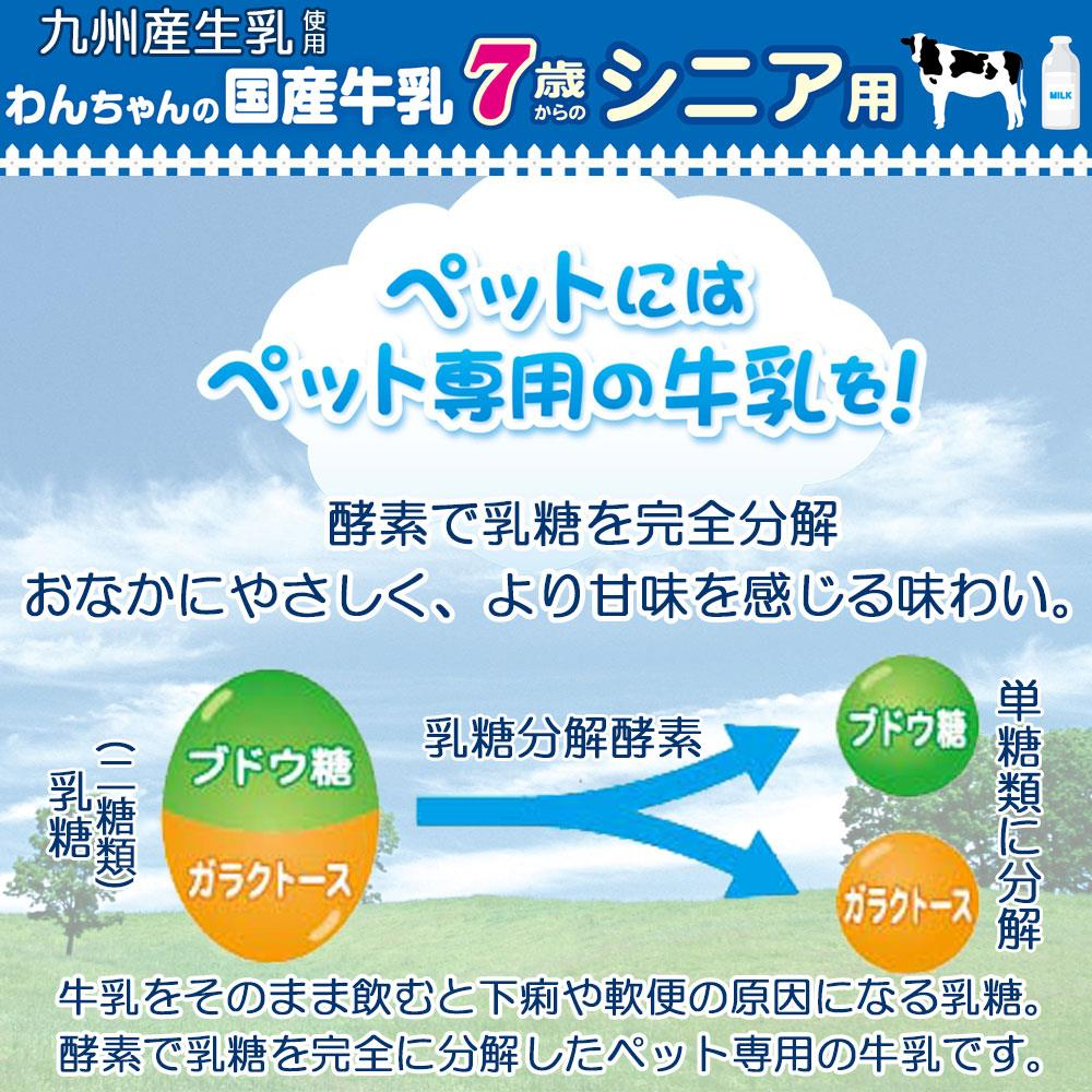 乳糖ゼロ、愛犬専用の牛乳。7歳からのシニア用。グルコサミン、コンドロイチン配合。九州産生乳使用。国産。おなかにやさしい乳糖ゼロ。製造過程で乳糖を完全分解。九州産生乳をそのまま国内工場で製造。安心できるおいしさ。着色料や香料は使用せず、生乳の旨さを最大限引き出している。関節の健康維持にグルコサミン、コンドロイチン配合。脱脂粉乳で成分調整した低脂肪タイプ。タウリン配合。