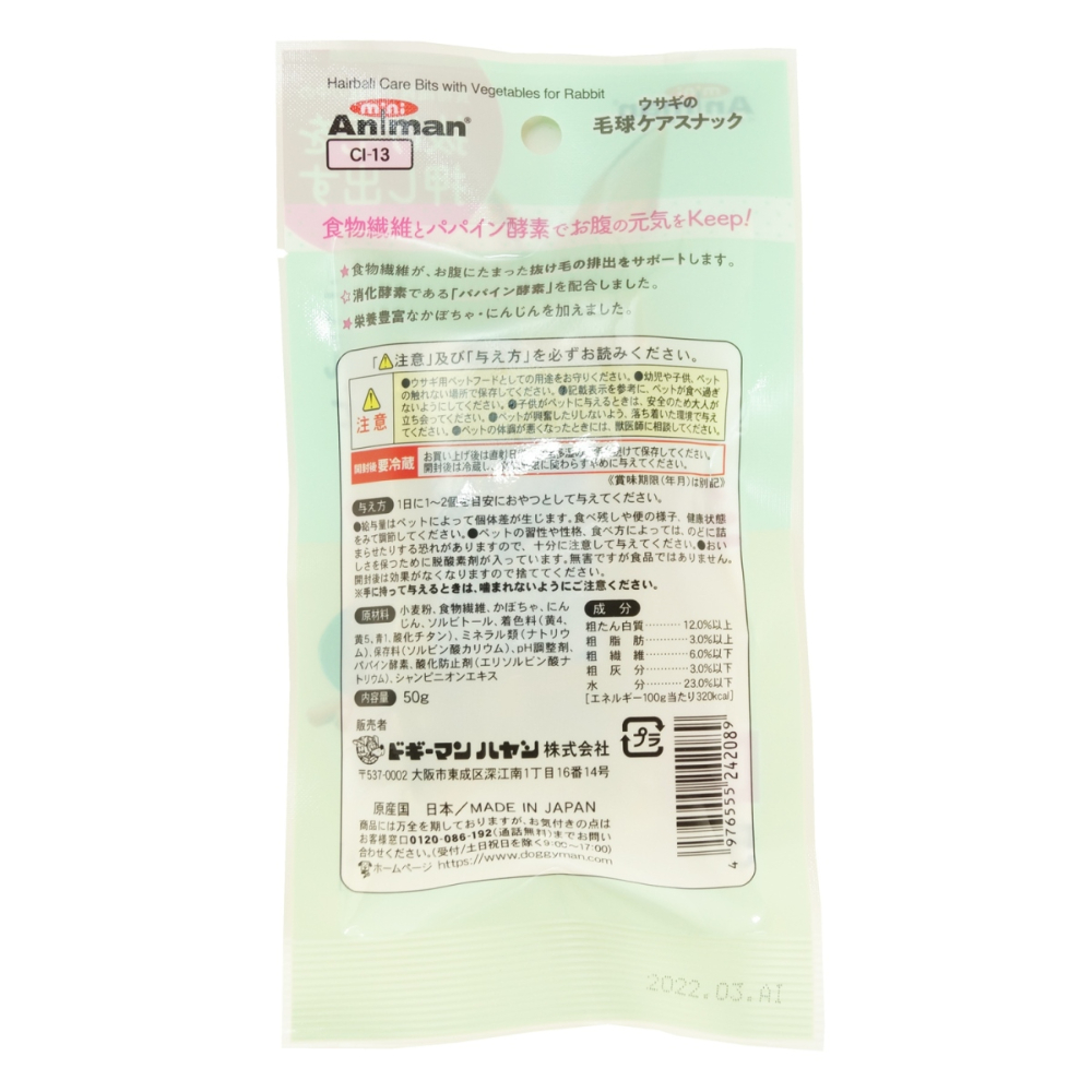 酵素や食物繊維を摂取して、おなかもすっきり!毛球のケアに。食物繊維とパパイン酵素、緑黄色野菜を配合。お腹の中でふくらんだ食物繊維が、毛づくろいなどでお腹にたまった抜け毛を押し出す。ウサギがたべやすいようにほどよい大きさにカットしたおやつ。排泄臭などの、気になるニオイを抑える天然消臭成分シャンピニオンエキスを配合。