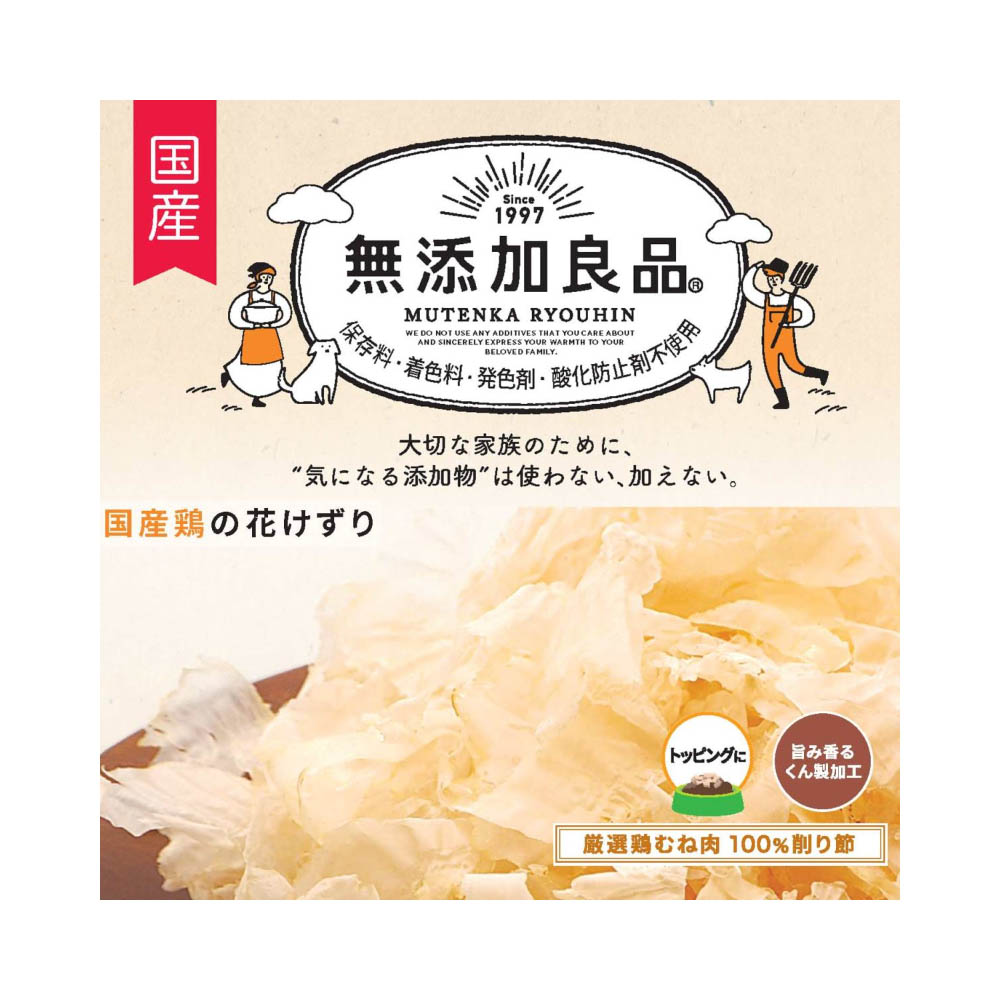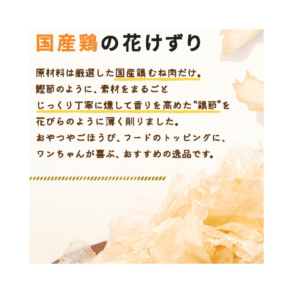 厳選した国産鶏胸肉のみを使用し、旨みと香りにこだわった薄くてふわふわの削り節。ペットフードとしての用途をお守りください。幼児や子供、ペットの触れない場所で保存してください。記載表示を参考に、ペットが食べ過ぎないようにしてください。子供がペットに与えるときは、安全のため大人が立ち会ってください。ペットが興奮したりしないよう、落ち着いた環境で与えてください。ペットの体調が悪くなったときには、獣医師に相談してください。・本品は保存料、着色料、発色剤、酸化防止剤の添加物を使用していません。・お買い上げ後は直射日光・高温多湿の場所を避けて保存してください。開封後は冷蔵し、賞味期限に関わらず早めに与えてください。