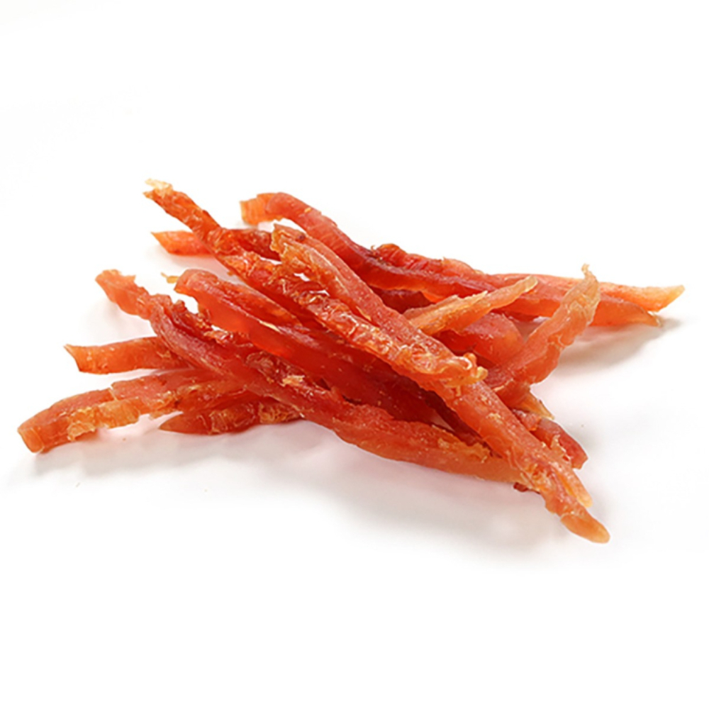 噛むほどに鶏ささみの濃厚な味わいがおくちの中にじんわり広がるセミソフトタイプ。食べやすい細切り。