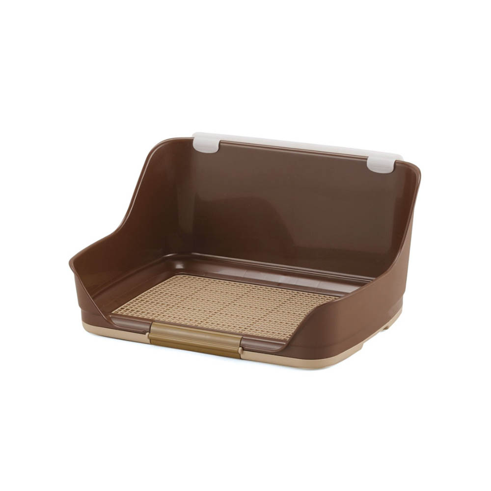 高い壁つきの犬用トイレ。足をあげておしっこをする子や、お尻がはみ出しがちな子におすすめです。背面の壁にペットシーツを固定できるので、おしっこの飛び散り防止にも効果的です。シーツへのいたずらを防ぐメッシュ付き。いたずらが無くなれば、メッシュを外してご使用いただけます。片側のロック解除でシーツの交換やトイレのお手入れも簡単。滑り止めが付いているので、フローリング等の上に置いても滑らず安心です。レギュラーサイズのシーツに対応使用中に破損・変形・劣化が見られた場合は、直ちに使用を中止してください。本製品は犬用の室内専用トイレです。他の用途には使用しないでください。安全にお使いいただくために、ご使用前に本体付属の取扱説明書を必ずお読みください。ペットが本体やメッシュを強く引っかいたり噛む場合は、ケガや誤飲を防ぐため使用をおやめください。