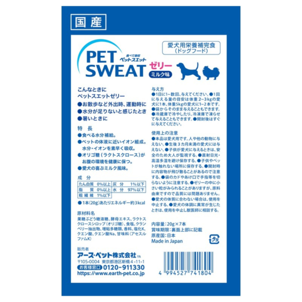 持ち運べて簡単スティックタイプ食べる水分補給。ペットの体液に近いイオン組成。水分・イオンを素早く吸収。オリゴ糖(ラクトスクロース)がお腹の環境を健康に保つ愛犬の喜ぶミルク味。