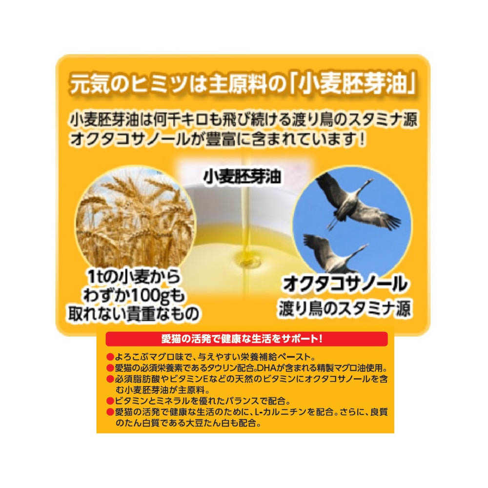 おいしくて与えやすいペーストタイプの栄養補完食。必須脂肪酸、ビタミンEなどの天然のビタミンを豊富に含む小麦胚芽油を配合。DHAが豊富に含まれる精製マグロ油を配合。ビタミンとミネラルをすぐれたバランスで配合。愛猫の必須栄養素であるタウリン配合。マグロ味で愛猫がよろこぶおいしさ。お買い上げ後は直射日光・高温多湿の場所は避け保管すること幼小児が誤飲しないように手が触れない場所に保管すること愛猫がチューブを飲み込む危険があるので保存場所に注意してください。直射日光・高温多湿の場所は避けて、保存してください。