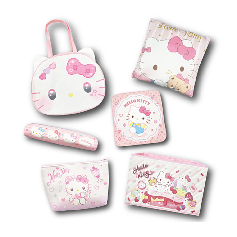 キティのフェイス形バッグの中にはクッション・収納ボックス・マルチポーチ、コスメポーチ・ハンドタオルの5点が入っています。いつでもキティと一緒にいられるラッキーバッグです。