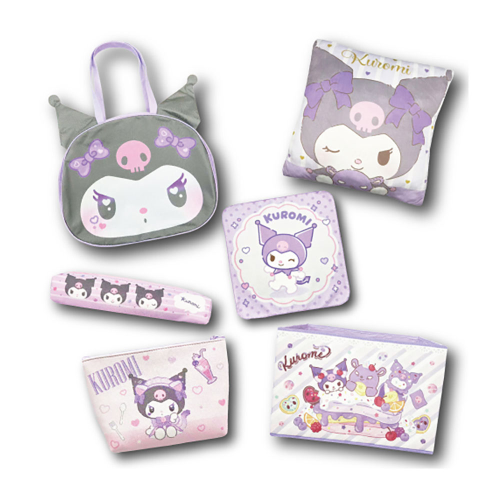 クロミのフェイス形バッグの中にはクッション・収納ボックス・マルチポーチ、コスメポーチ・ハンドタオルの5点が入っています。いつでもクロミと一緒にいられるラッキーバッグです。