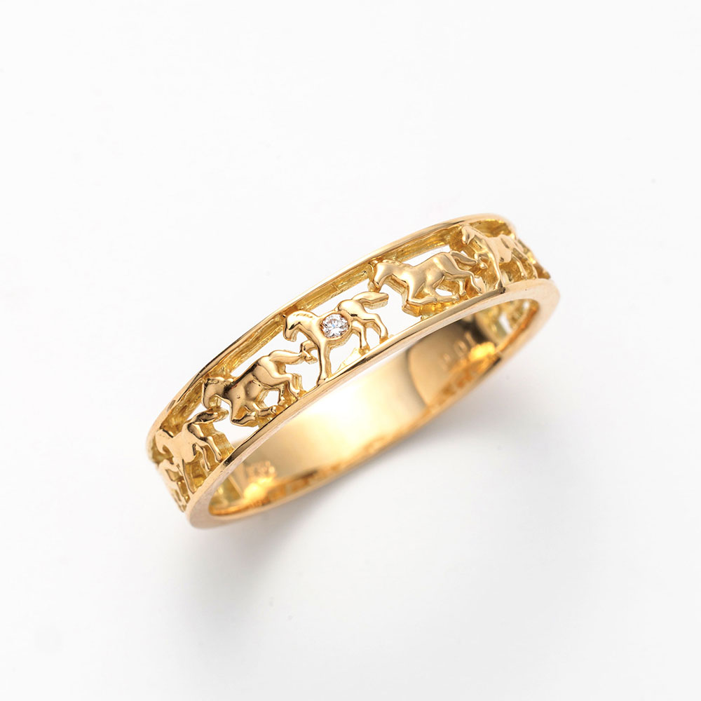 9頭の馬が駆ける縁起の良い図柄で、「万事何事もうまくいく」という意味が込められています。馬は幸運や運気を上げるモチーフとして古くから親しまれており、特に九頭の馬が描かれた「馬九行久(うまくいく)」は、九つの異なる運気(商売繁盛、金運、家庭運、健康運など)を表し、あらゆる面で「うまくいく」ことを願う縁起物として親しまれています。そんな「万事何事もうまくいく」デザインの18金ダイヤリングです。