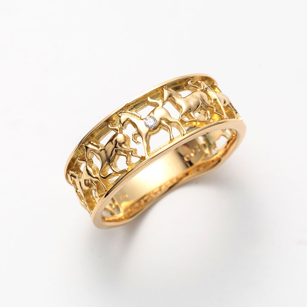 9頭の馬が駆ける縁起の良い図柄で、「万事何事もうまくいく」という意味が込められています。馬は幸運や運気を上げるモチーフとして古くから親しまれており、特に九頭の馬が描かれた「馬九行久(うまくいく)」は、九つの異なる運気(商売繁盛、金運、家庭運、健康運など)を表し、あらゆる面で「うまくいく」ことを願う縁起物として親しまれています。そんな「万事何事もうまくいく」デザインの18金ダイヤリングです。