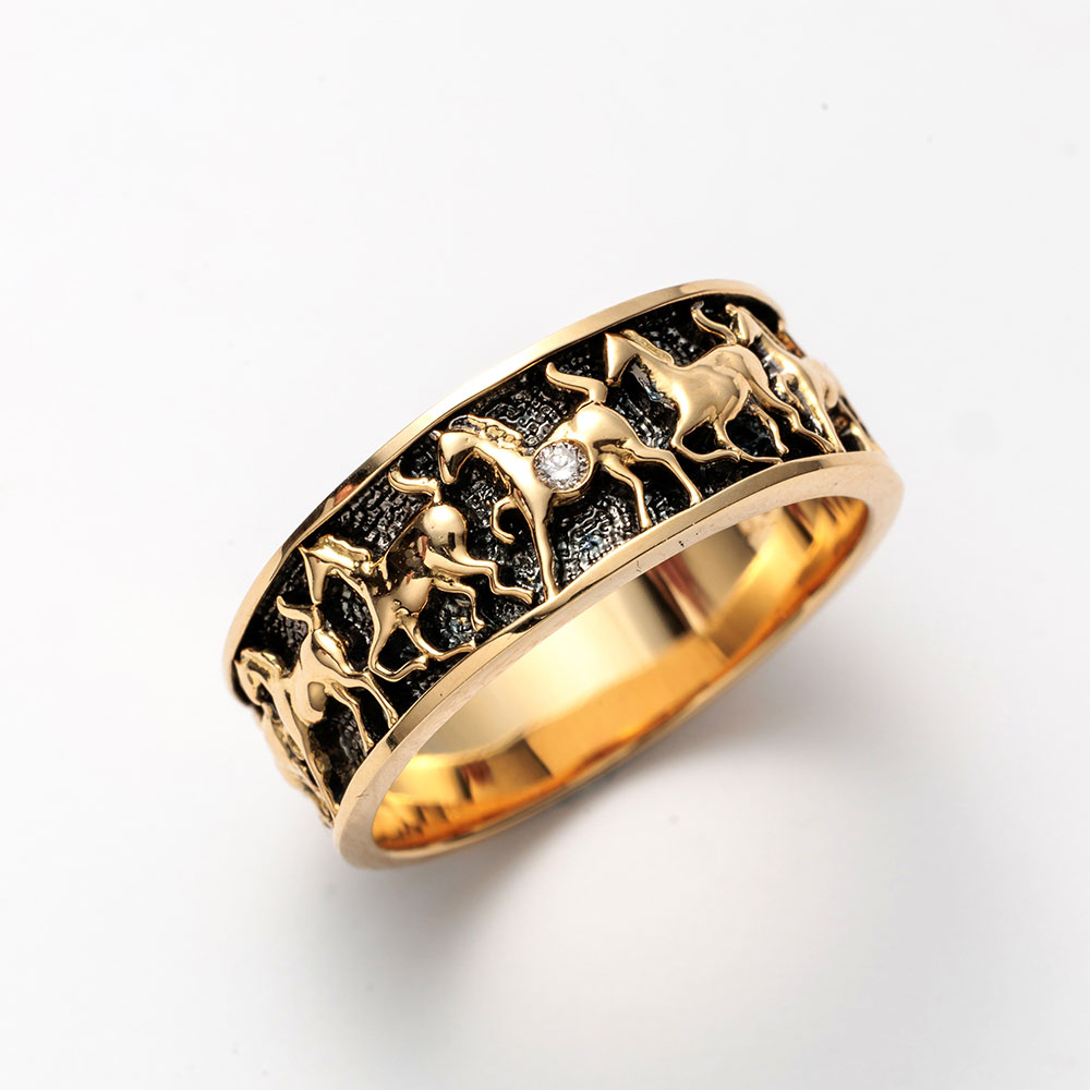 9頭の馬が駆ける縁起の良い図柄で、「万事何事もうまくいく」という意味が込められています。馬は幸運や運気を上げるモチーフとして古くから親しまれており、特に九頭の馬が描かれた「馬九行久(うまくいく)」は、九つの異なる運気(商売繁盛、金運、家庭運、健康運など)を表し、あらゆる面で「うまくいく」ことを願う縁起物として親しまれています。そんな「万事何事もうまくいく」デザインの18金ダイヤリングです。
